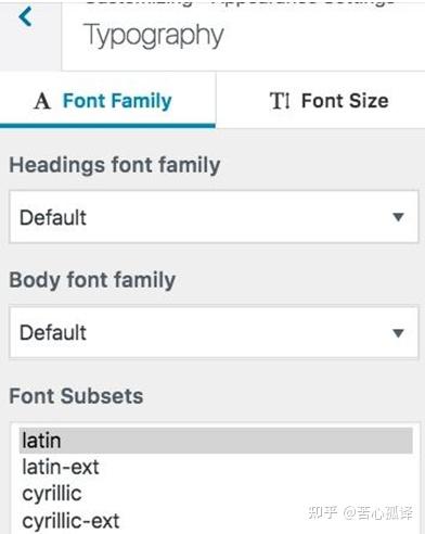 下一步就是可能需要調整一下網站整體文字的字體。調整字體的方法是在自定義部分的側邊欄裡按照Appearance Settings→Typography的步驟來操作。用戶可以一邊選用字體,一邊查看網站的變化效果。
