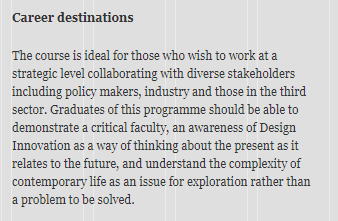 學校也會保障該專業的畢業生將有在管理領域能發表自己的個人看法的能力,並有機會在復雜的社會,經濟和政治背景下定義設計師的全新角色。