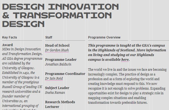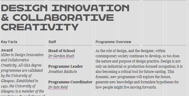 這一系列課程也被GSA譽為定義未來設計師的培養方向,院校也為此集中了一批大師級別的教學團隊,例如銀器大師Roger Millar教授,歐洲的印刷和造紙專家Jacki Parry教授等等,還為特別配備了很多硬件設施齊全的工作室。