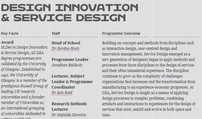 隨著從製造業到體驗經濟的轉變,交互設計師將面臨的考驗也將更加複雜。在GSA服務設計,學生將被教授將產品和交互作用、以及個人經驗結合起來,以空間和時間的形式展現設計作品的方法。