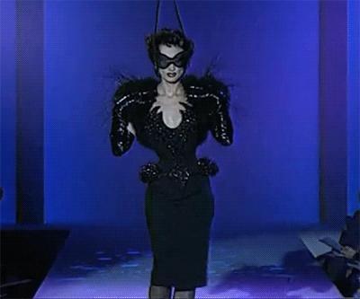 從動畫魅力到Cruella de Vil動物主義和20世紀40年代的權力著裝,Thierry Mugler在設計中表達了許多人不敢觸碰的題材,還有像是代表權利的警察比如rape、BDSM比如正裝搭配性感吊帶內衣。