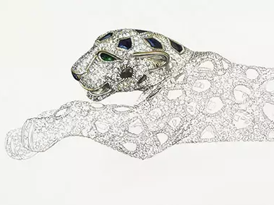 卡地亞的經典獵豹於1914年誕生,當時的設計是在一塊腕錶上雕刻了獵豹圖樣。利用天然材質,搭配簡約黑白,首次開創斑點圖案珠寶的先河,