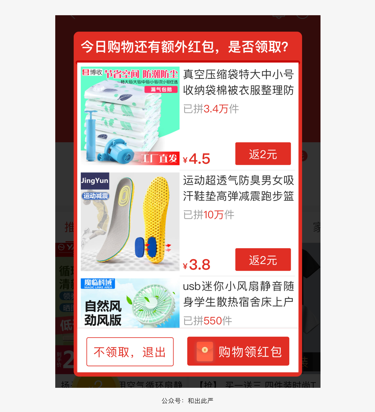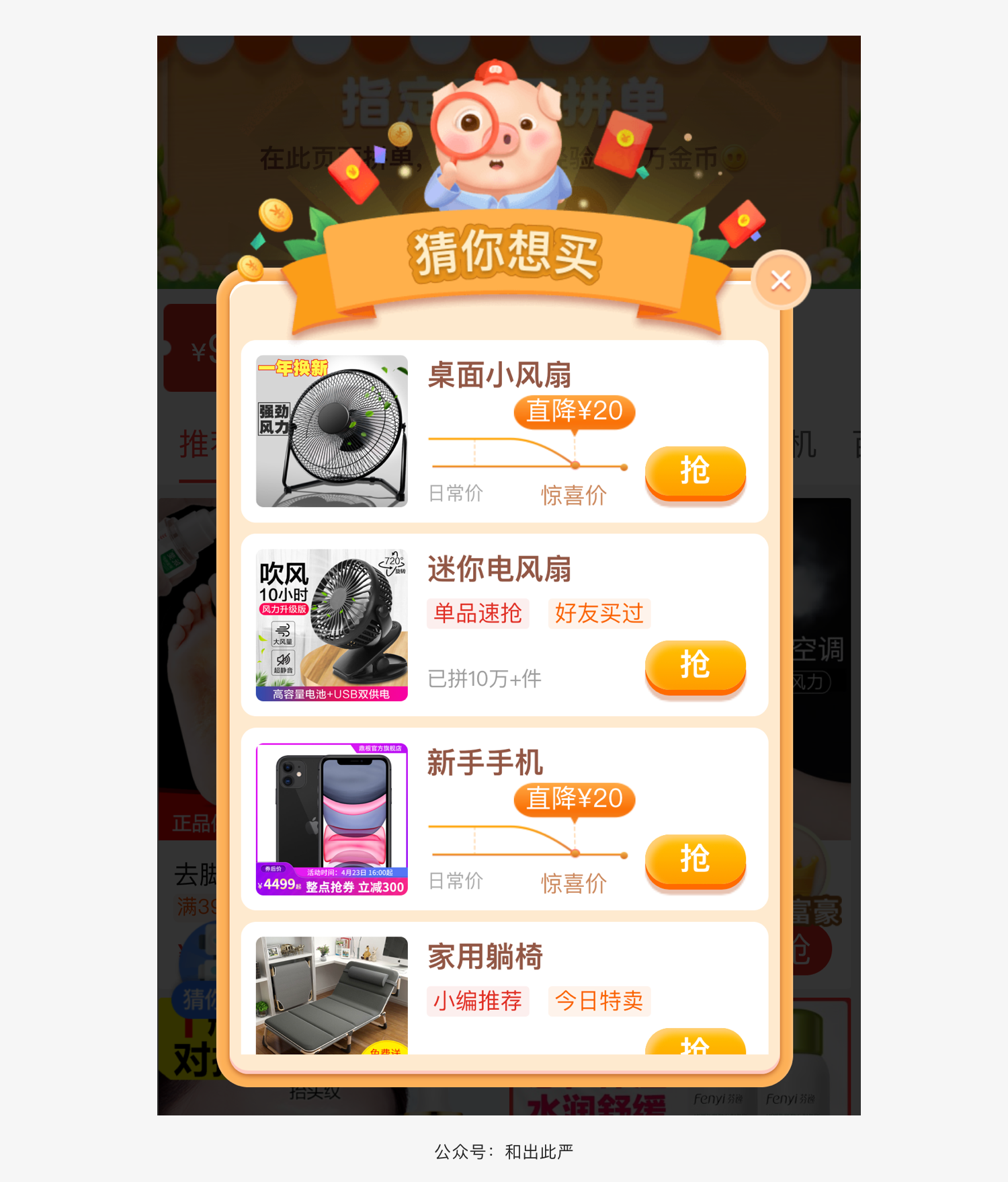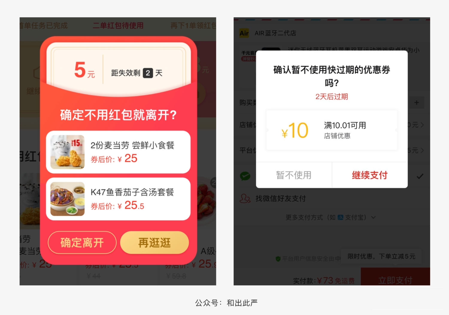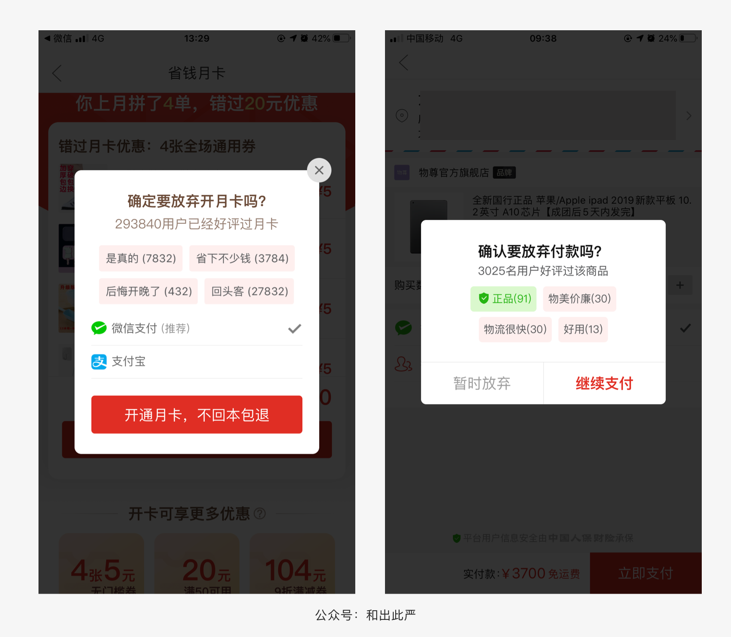 如拼多多用戶放棄提交訂單、開通月卡時,會彈出該商品的購買人數、用戶反饋等信息提示,以此來增加商品的吸引力,減少訂單的流失。