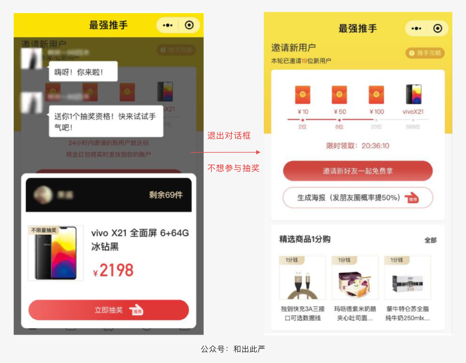 就如'最強推手'的抽獎活動,就算用戶不參與抽獎,退出該對話框也是直接進入到邀請詳情頁,裡面更多的活動獎勵和推薦內容都在等著ta...
