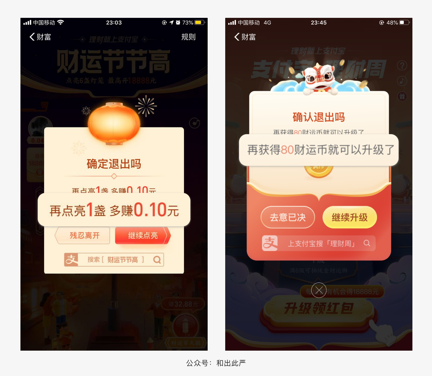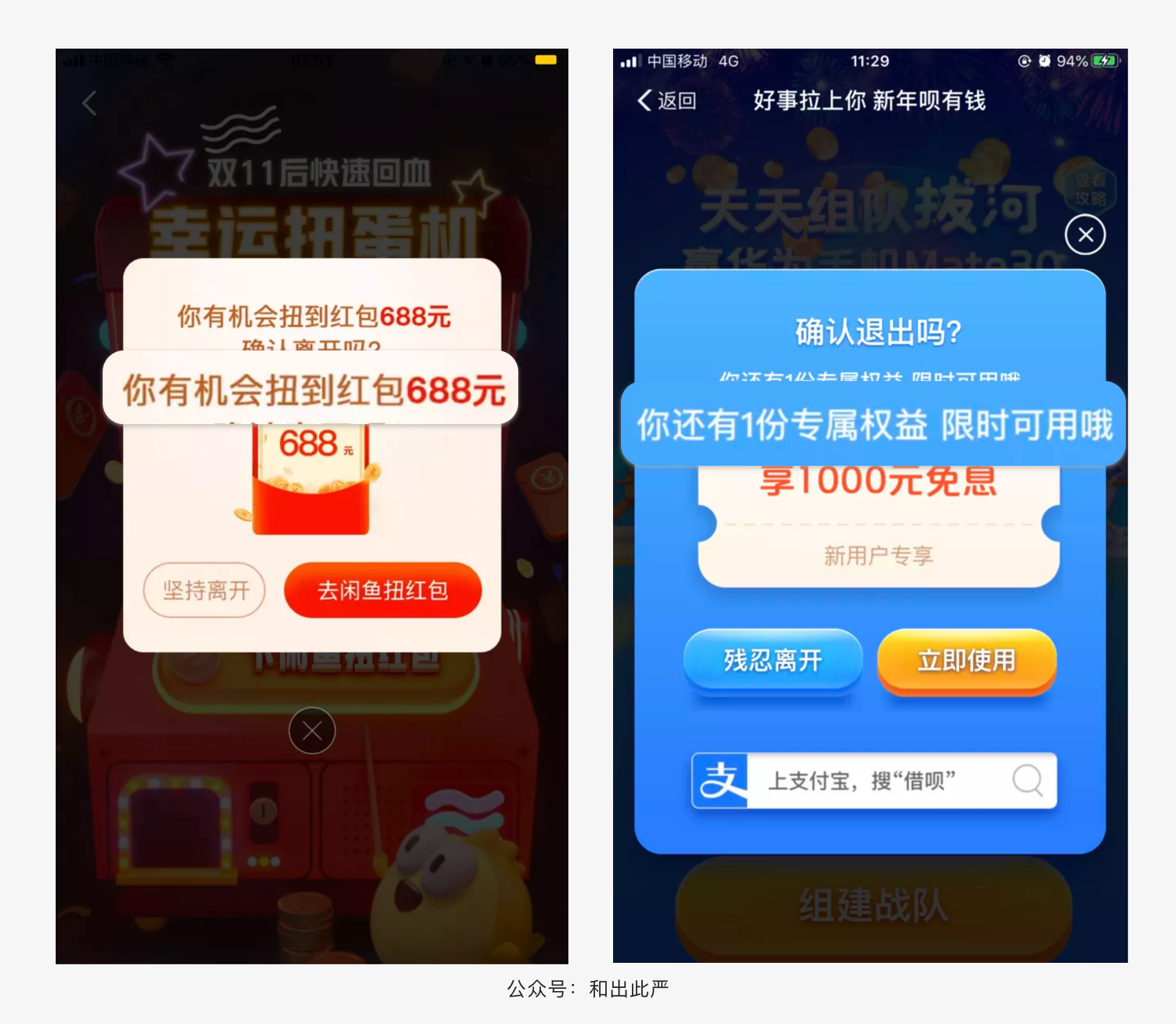 讓用戶判斷當前的退出決策是否正確,畢竟相對於'收穫'來說,'損失'更讓人在乎某事物。並且運用一些“挑釁”手段,能降低用戶流失的可能。