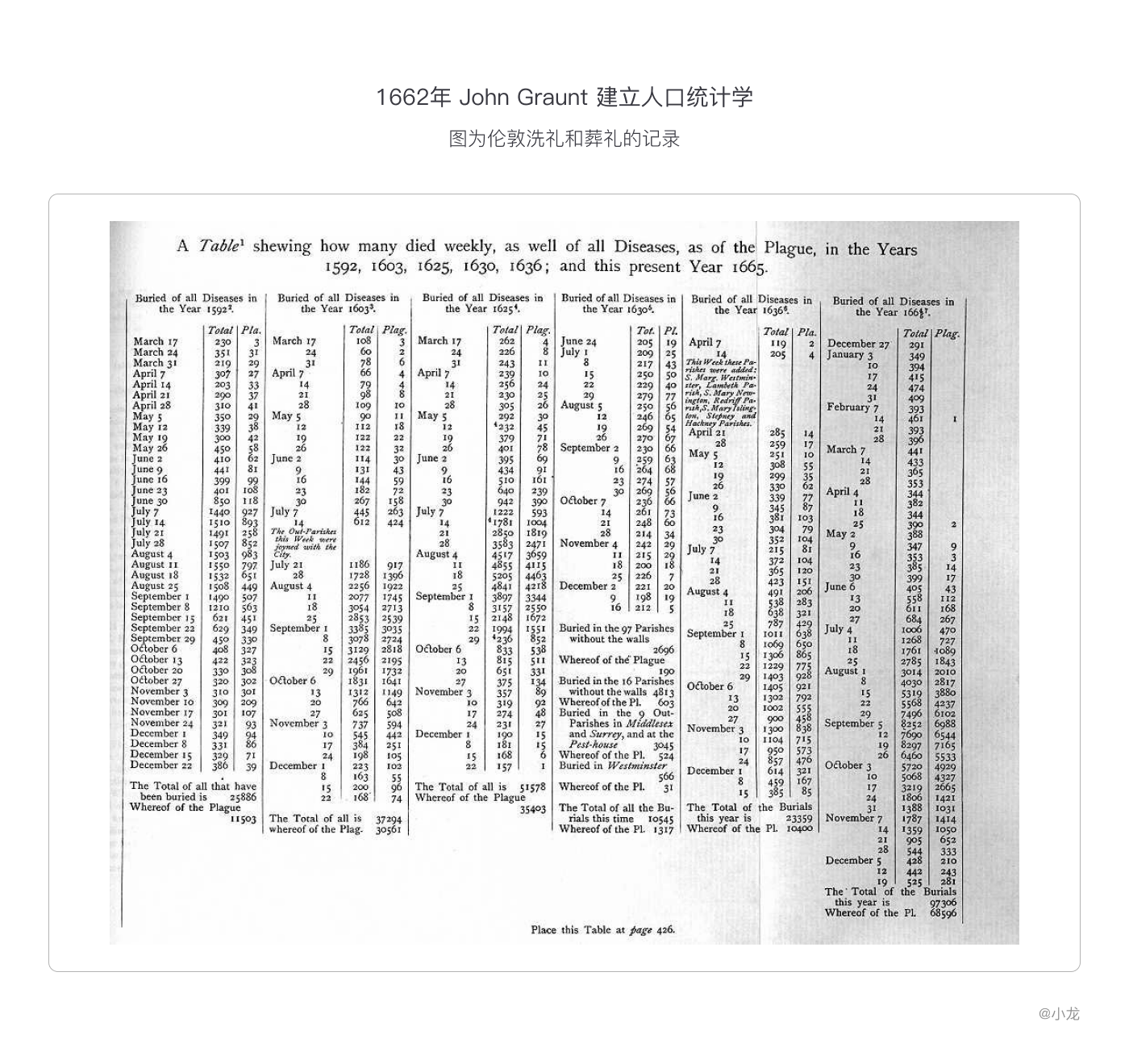 1662年John Graunt 建立人口統計學:統計數據概念的重要發展。圖為倫敦洗禮和葬禮的記錄,倫敦的平均預期壽命為27歲,其中16%的人到16歲時死亡。