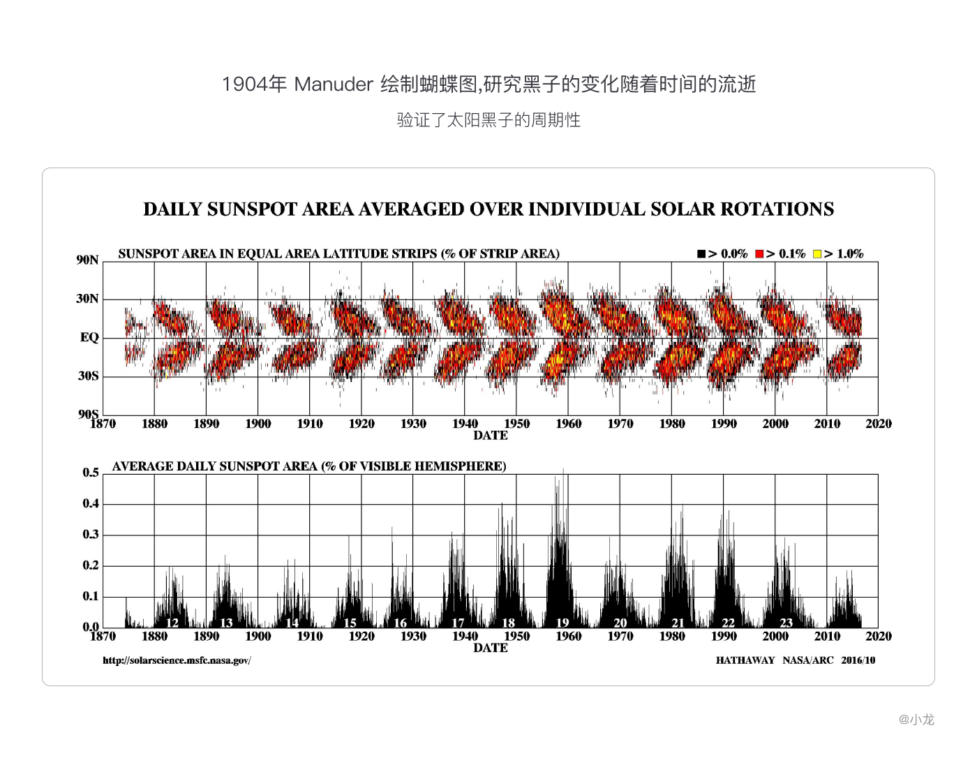 1904年Manuder 繪製蝴蝶圖,研究黑子的時間變化,驗證了太陽黑子的周期性。