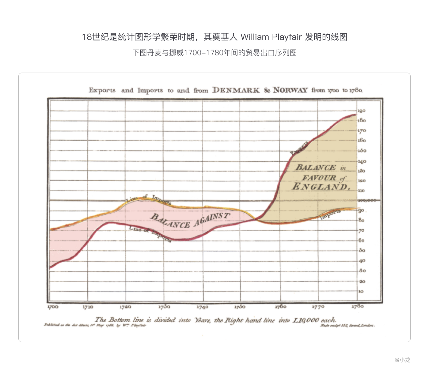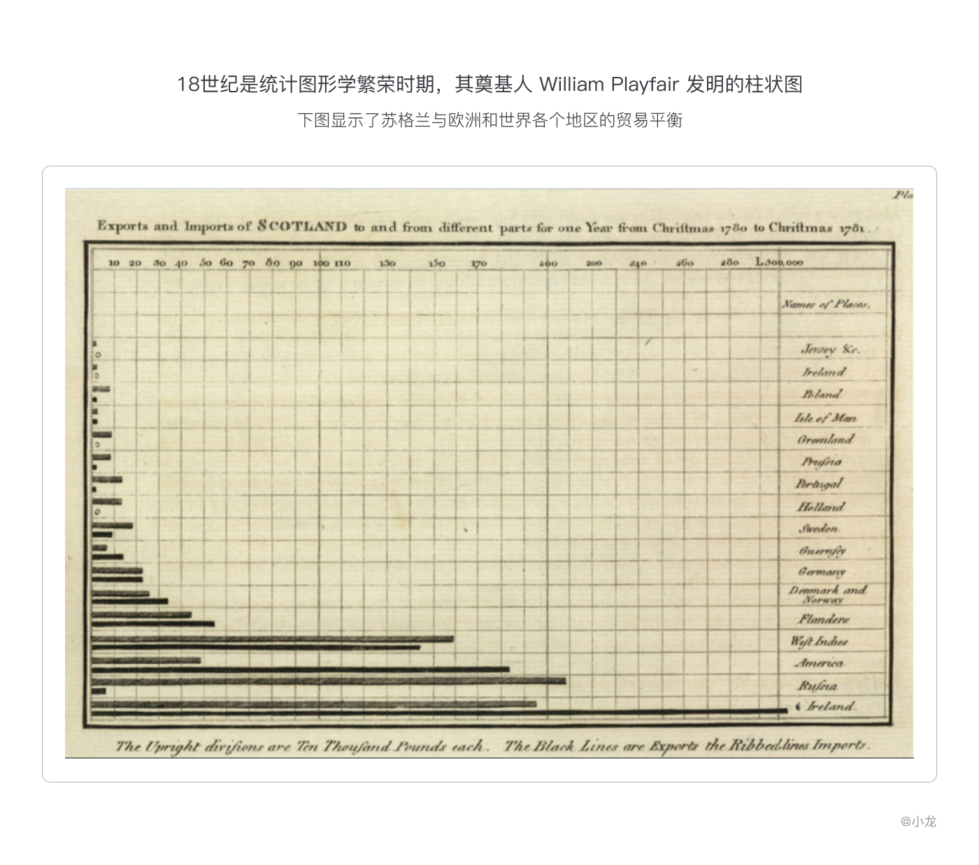 18世紀是統計圖形學繁榮時期,其奠基人William Playfair 發明了折線圖、柱狀圖、餅狀圖、圓圖。他的經歷非常曲折。他依次是一位麥賴特人,工程師,製圖員,會計師,發明家,銀匠,商人,投資經紀人,經濟學家,統計學家,小冊子作者,翻譯,公關人員,土地投機者,定罪者,銀行家,熱情的保皇黨人,編輯,敲詐者和新聞記者。他設計的圖表構成了當今數據可視化的核心要素。