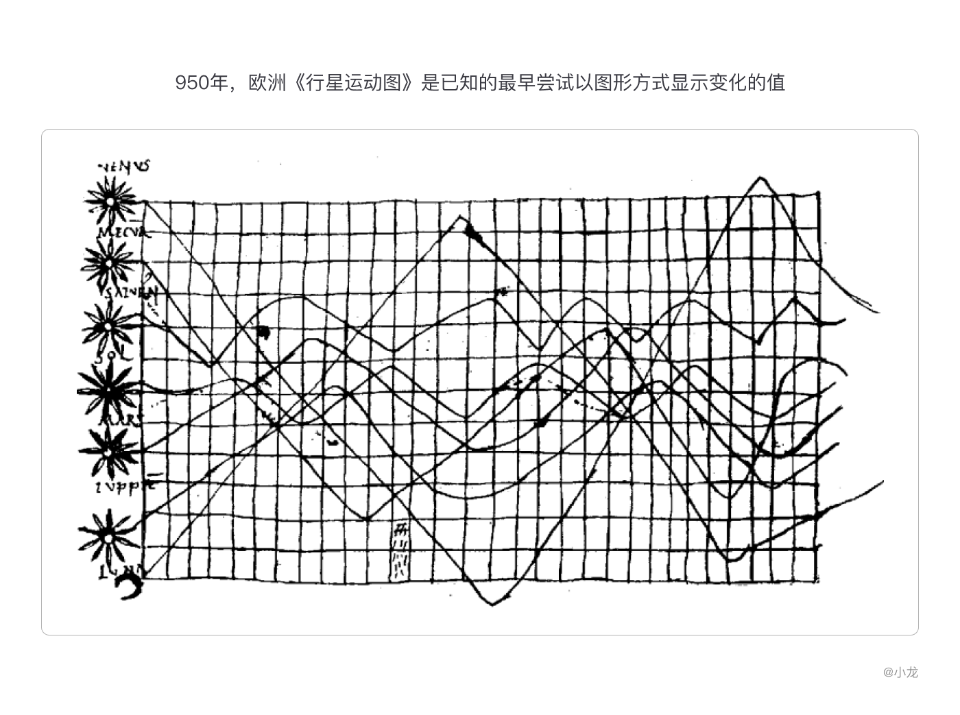 950年,歐洲《行星運動圖》是已知的最早嘗試以圖形方式顯示變化的值(全年中太陽,月亮和行星的位置)。