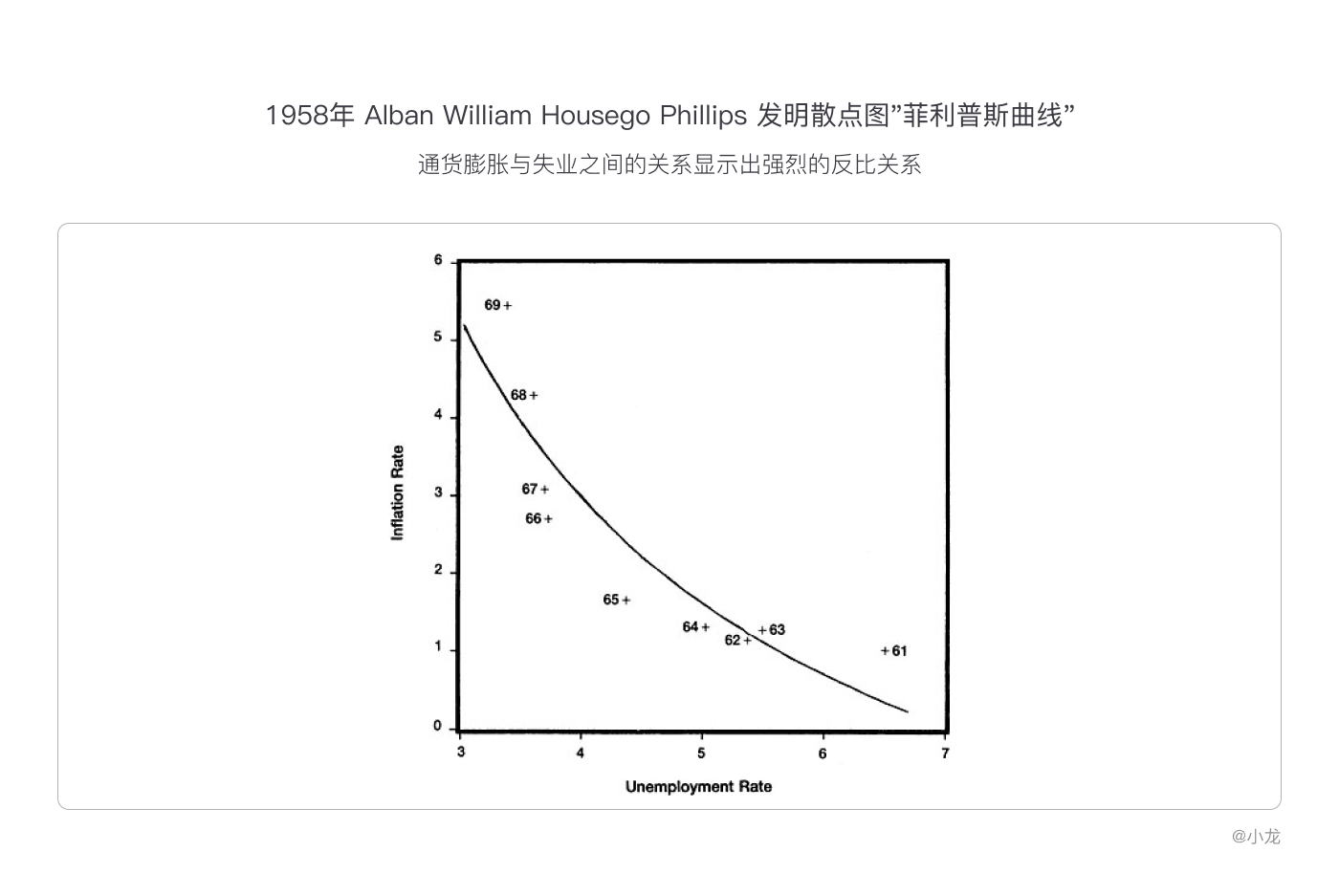 1958年Alban William Housego Phillips 發明散點圖"菲利普斯曲線" ,通貨膨脹與失業之間的關係顯示出強烈的反比關係,促進宏觀經濟理論的發展。