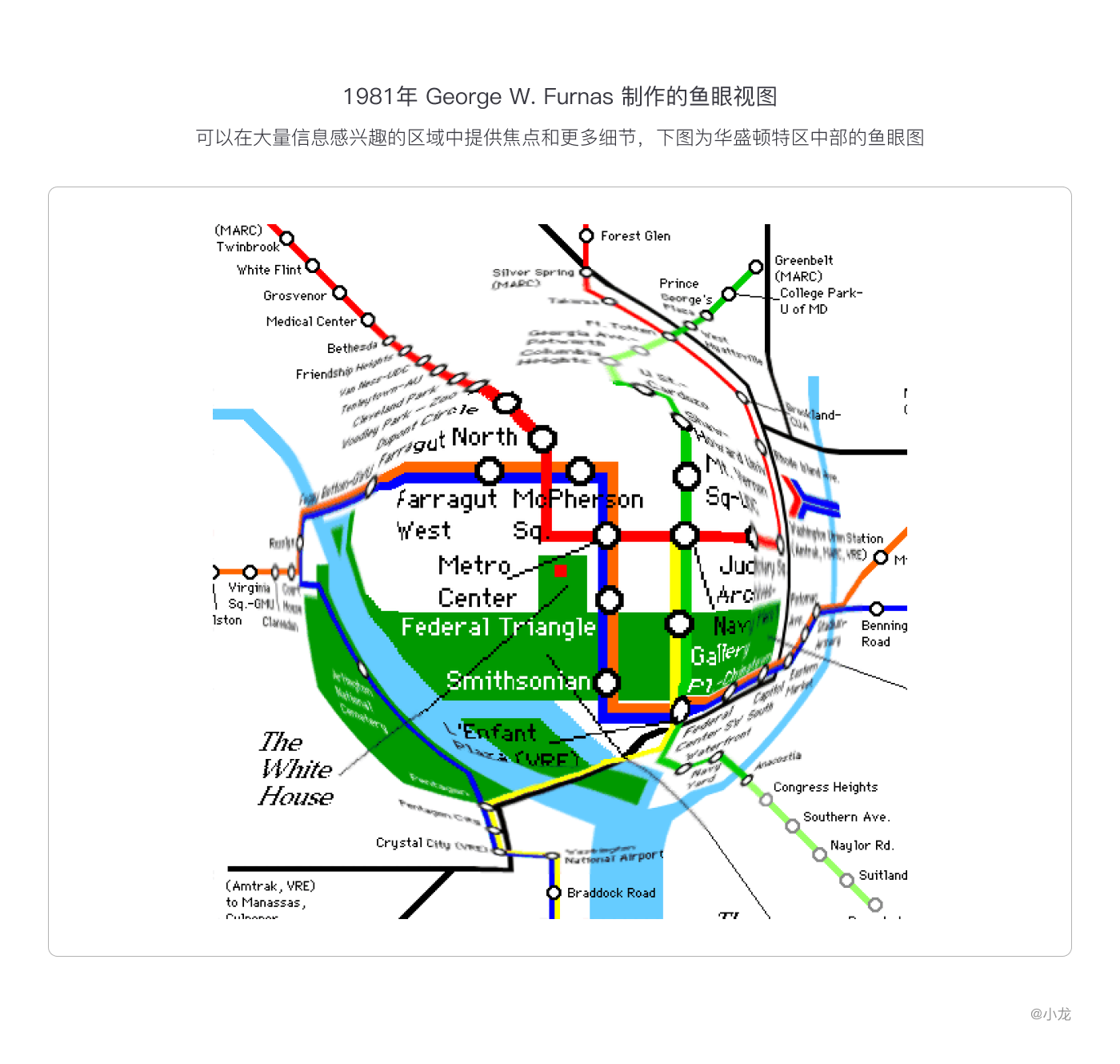 1981年George W. Furnas 製作的魚眼視圖:一種新的想法,可以在大量信息感興趣的區域中提供焦點和更多細節,同時以較少的細節保留周圍環境。下圖為華盛頓特區中部的魚眼圖。