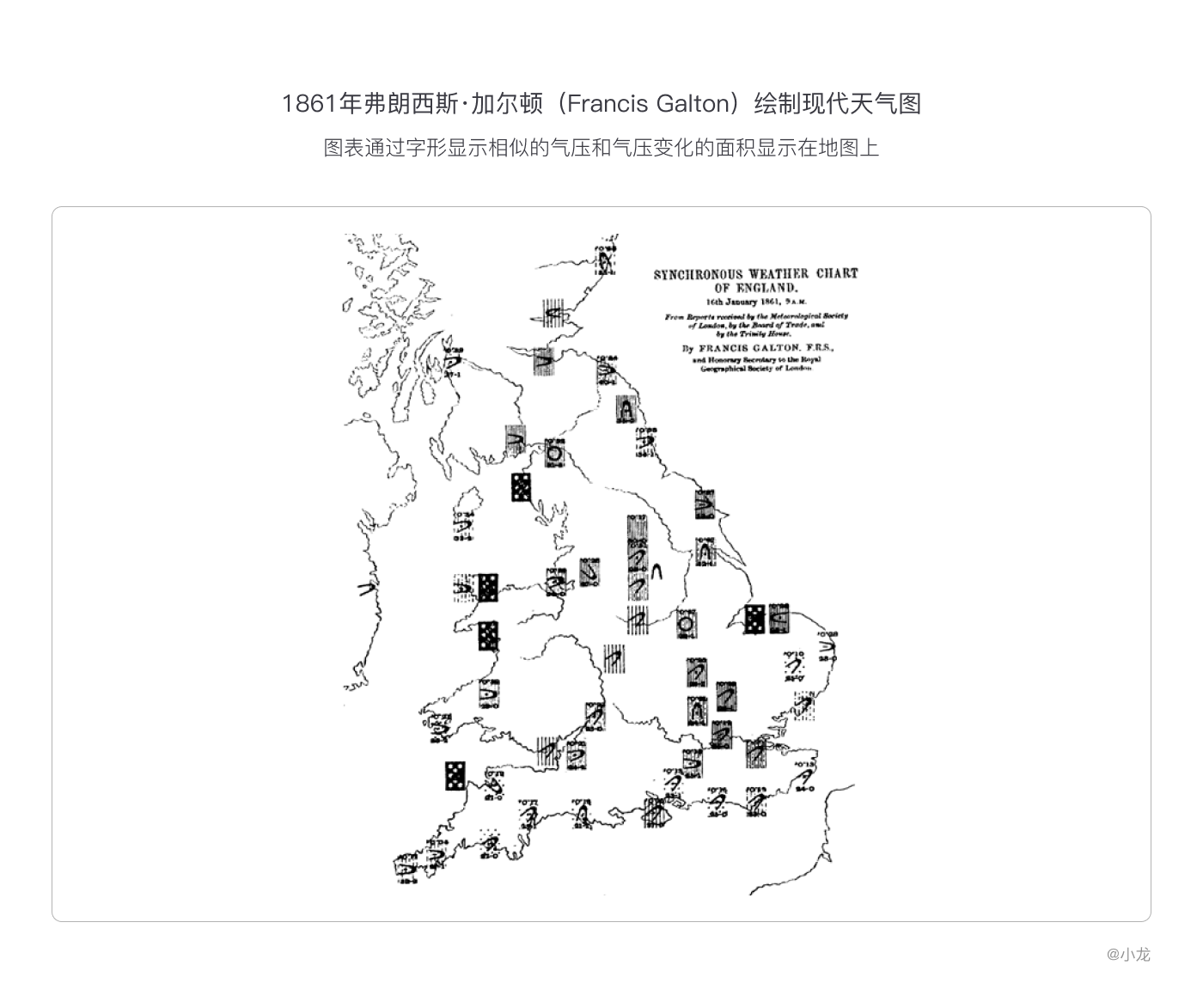 1861年弗朗西斯·加爾頓(Francis Galton)繪製現代天氣圖,圖表在地圖上通過字形顯示相似的氣壓和氣壓變化。這些導致發現了低壓周圍風的反氣旋運動。