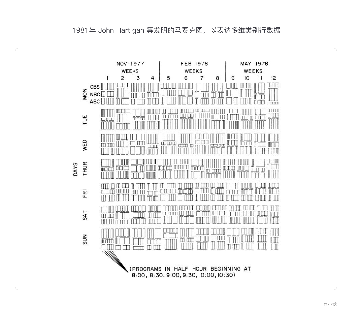 1981年John Hartigan 等發明的馬賽克圖,以表達多維類別行數據。下圖為Hartigan和Kleiner5路馬賽克電視收視率。