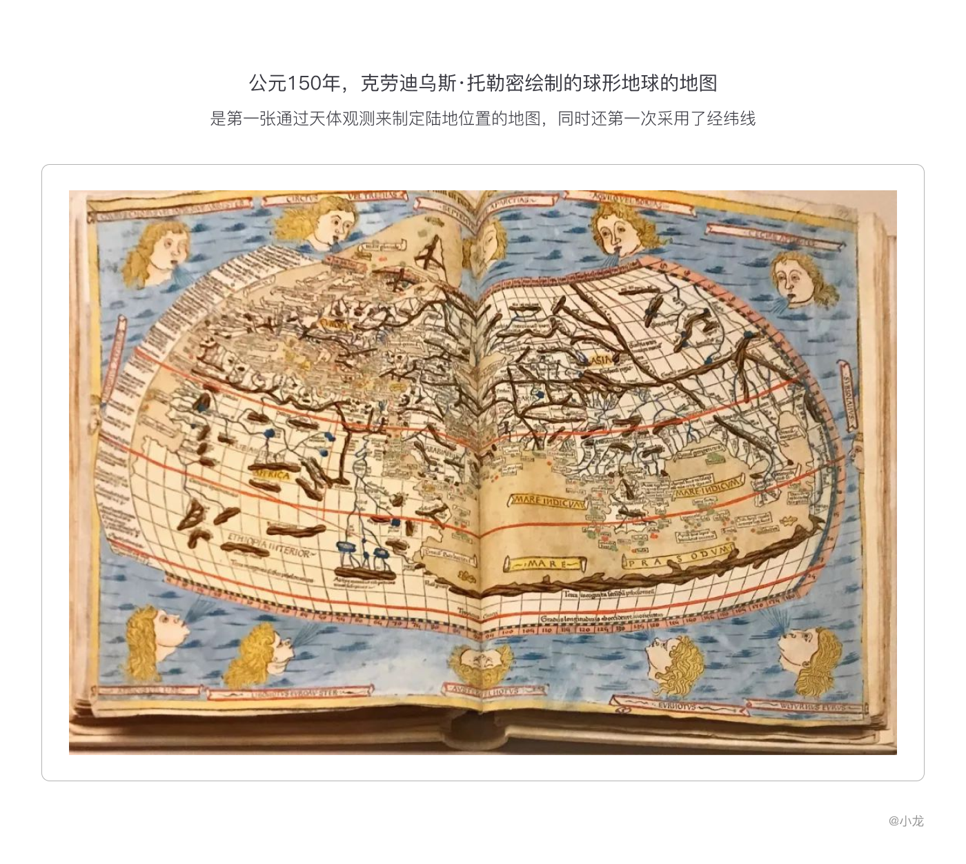 公元150年,克勞迪烏斯·托勒密繪製的球形地球地圖,是第一張通過天體觀測來製定陸地位置的地圖,同時第一次採用了經緯線。托勒密詳細揭示瞭如何採用兩種方法將球體的地球繪製到平面上,探討了地圖投影和比例尺的問題,明確了地圖應該“上北下南”,並且以扇形的方式將球形地圖展開,直到今天,這些理論仍然是地形圖和世界地圖繪製的標杆。
