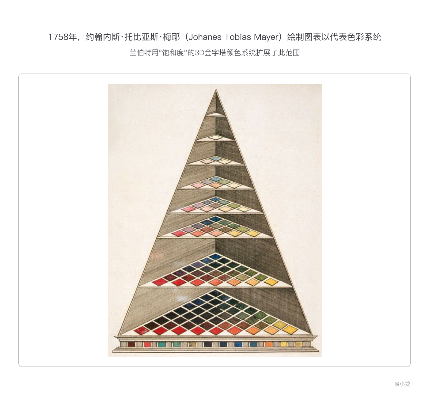 1758年,約翰內斯·托比亞斯·梅耶(Johanes Tobias Mayer)開發圖表以代表色彩系統,一種構造和命名許多顏色的系統。蘭伯特用"飽和度''的3D金字塔顏色系統擴展了此範圍。