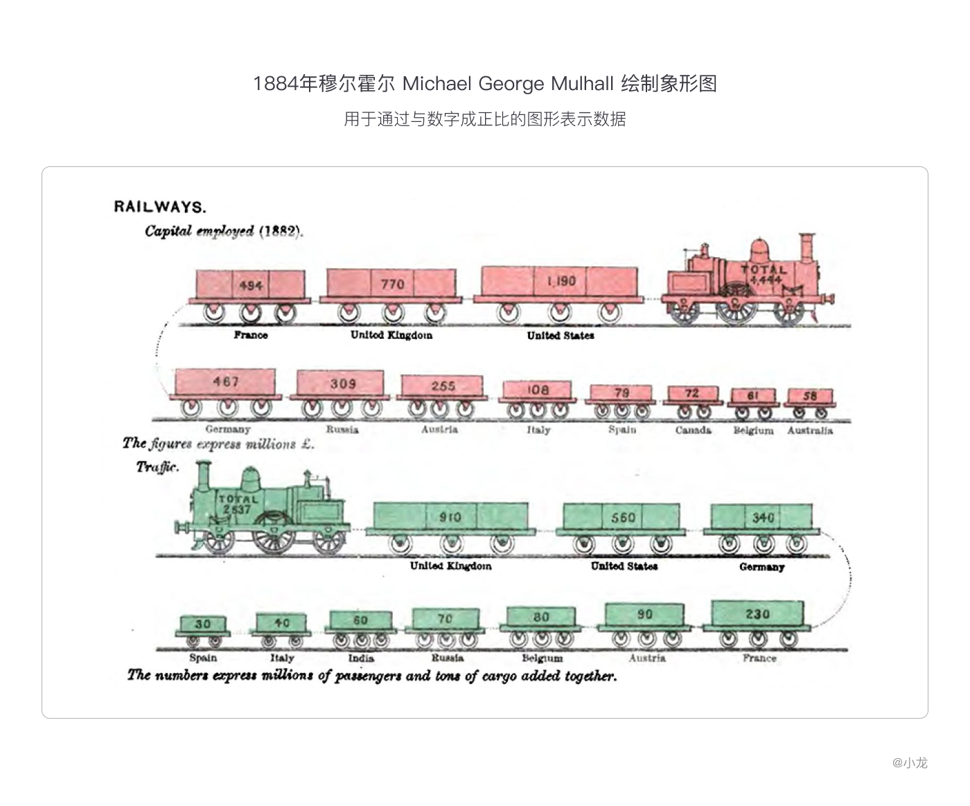 1884年穆爾霍爾Michael George Mulhall 繪製象形圖,用於通過與數字成正比的圖形表示數據。
