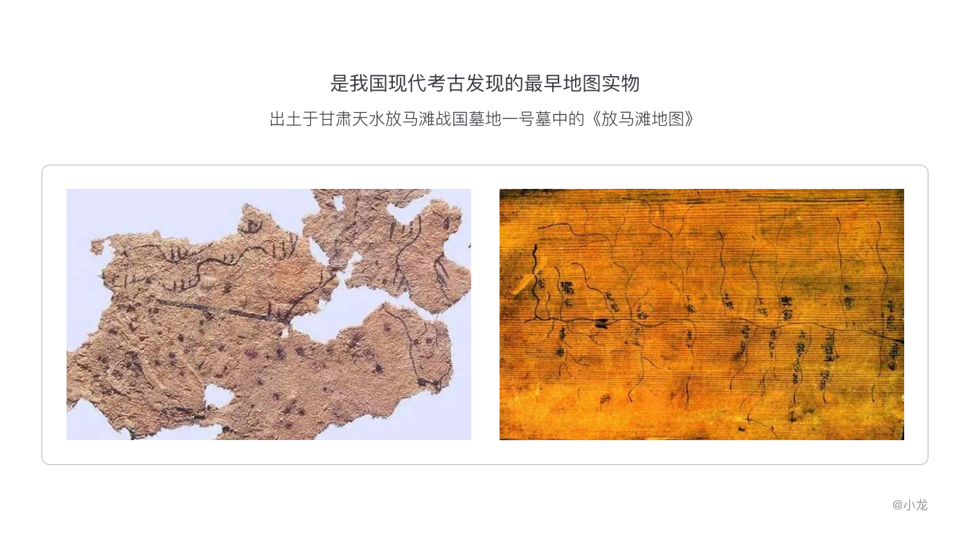 中國的地圖最早見於夏朝,《史記·夏本紀》記載了夏禹治水的事蹟,地圖繪製在鼎上,九鼎是見於文獻記載的、刻繪有九州山川形勢的原始實物地圖。現代考古發現的我國最早的地圖實物,是出土於甘肅天水放馬灘戰國墓地一號墓中的《放馬灘地圖》。