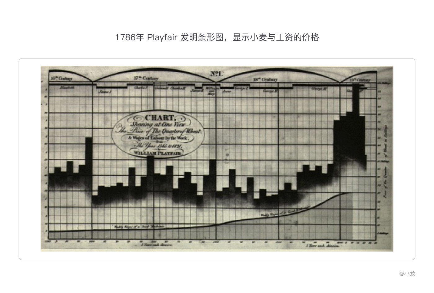 1786年Playfair 發明條形圖,顯示小麥與工資的價格。