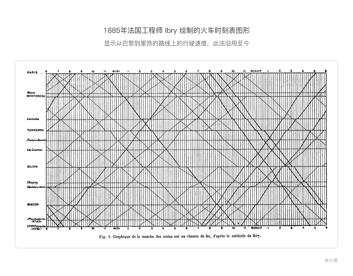 1885年法國工程師Ibry 繪製的火車時刻表圖形,顯示從巴黎到里昂的路線上的行駛速度。此法沿用至今。