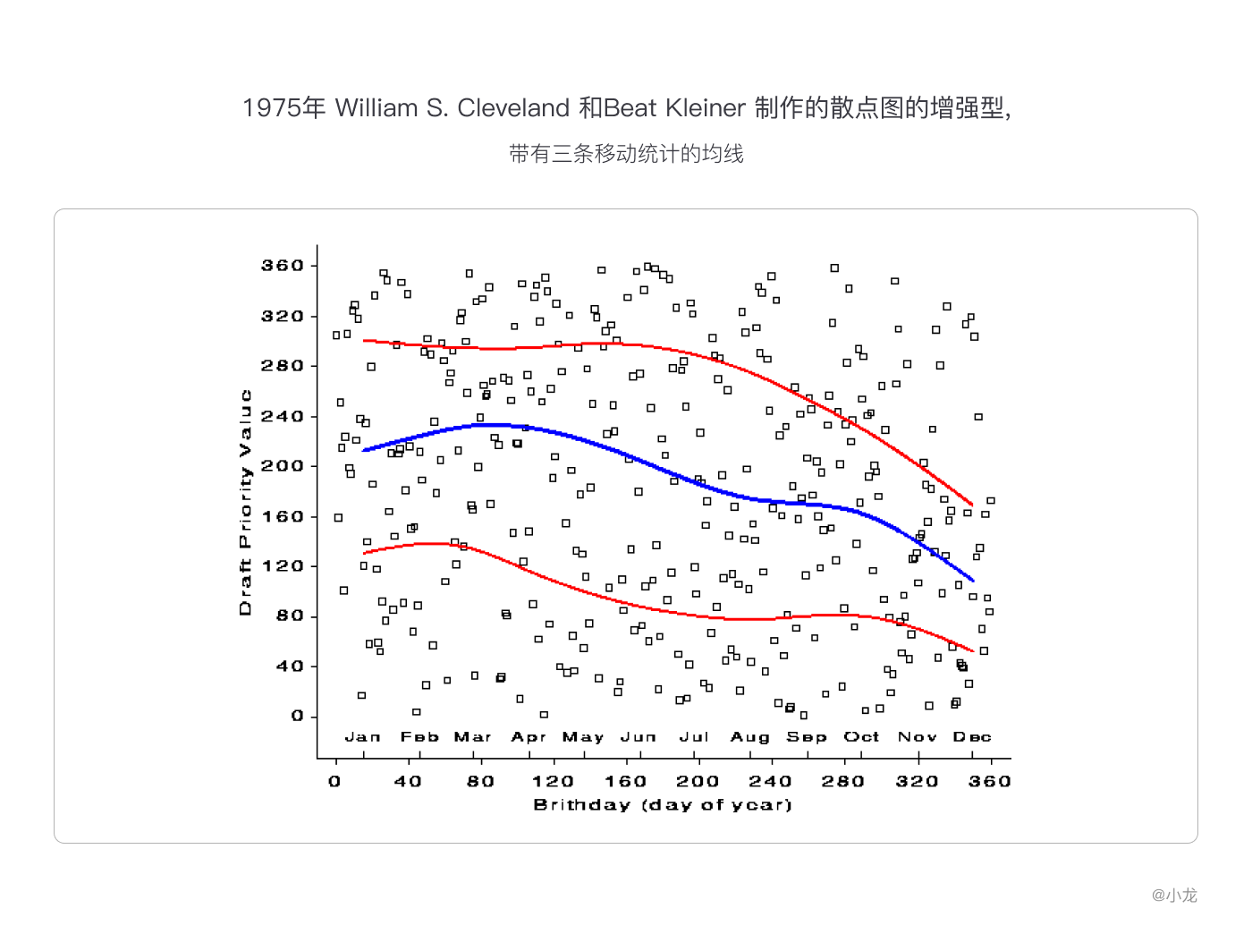 1975年William S. Cleveland 和Beat Kleiner 製作的散點圖增強型, 帶有三條移動統計的均線。下圖為美國1970年彩票數據草稿。