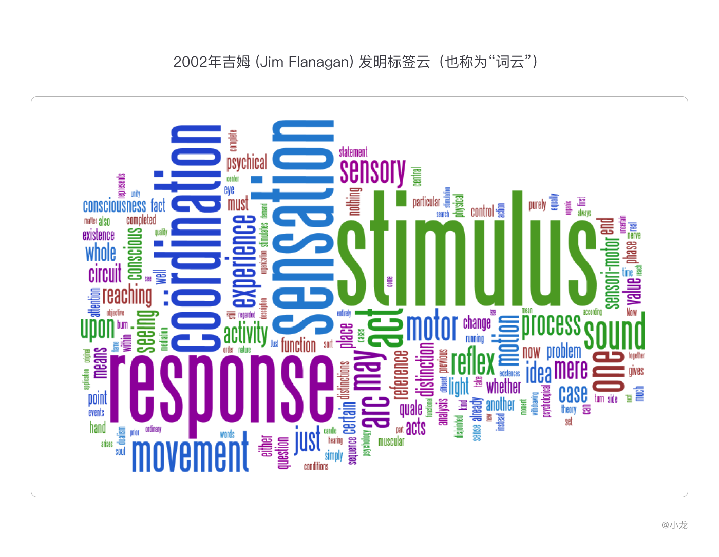 2002年吉姆(Jim Flanagan) 發明標籤雲(也稱為“詞云”)在視覺上刺激了大型文本的摘要。他們的目的是選擇文本並直觀地顯示該文檔中最常用的單詞的出現頻率。通過突出顯示感興趣的特定作品中的主要主題,這些對於定性分析很有用。