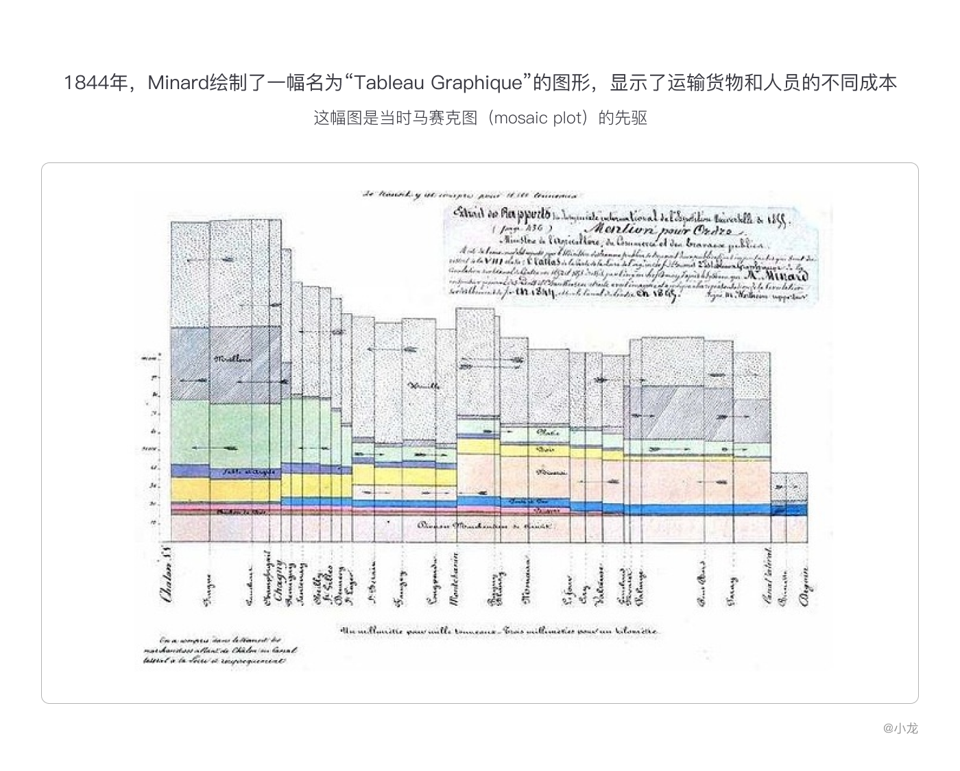 1844年,Minard繪製了一幅名為“Tableau Graphique”的圖形,顯示了運輸貨物和人員的不同成本。在這幅圖中,他創新的使用了分塊的條形圖,條形塊圖的寬度對應路程,高度對應旅客或貨物種類的比例。這幅圖是當時馬賽克圖(mosaic plot)的先驅。