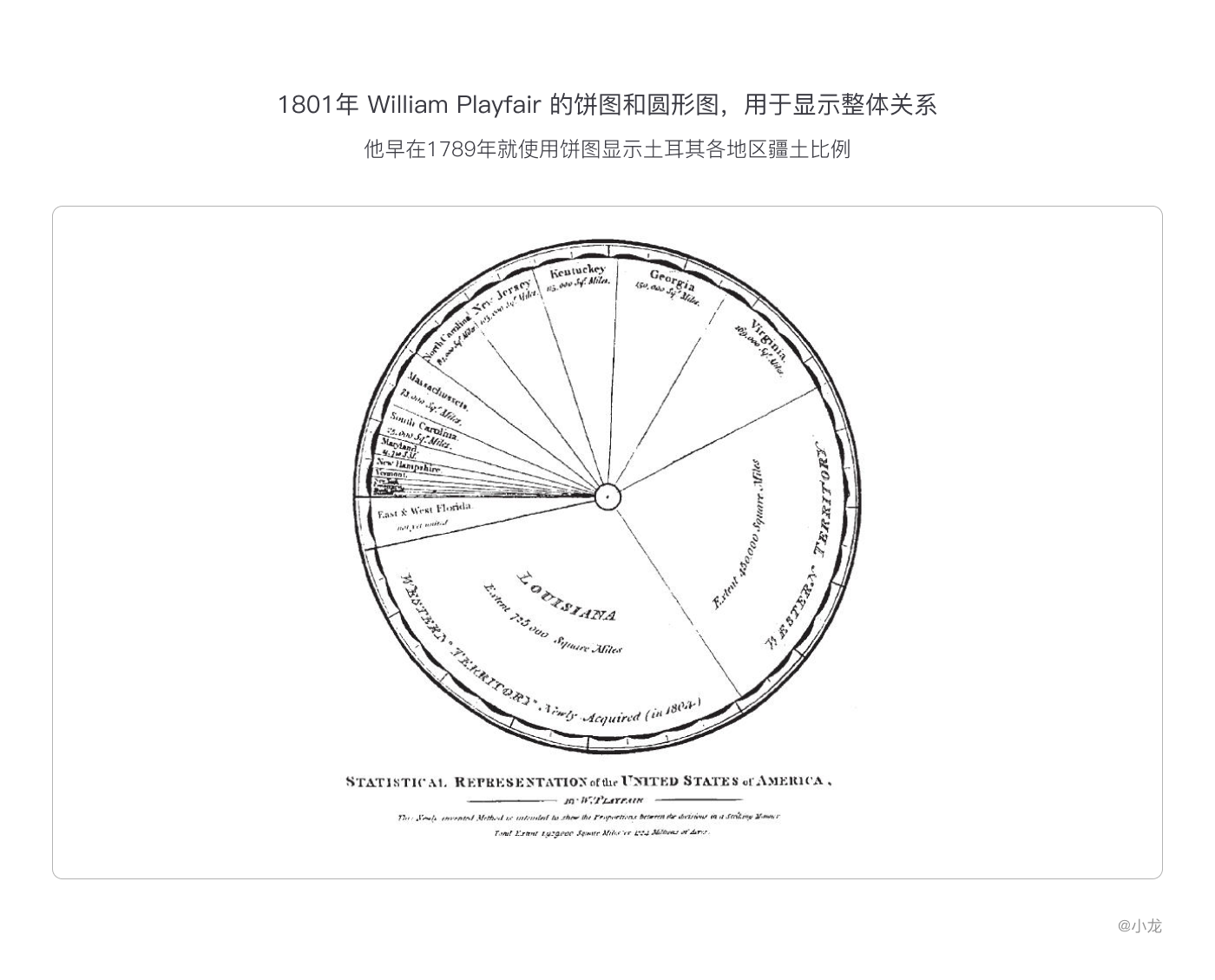 1801年William Playfair 的餅圖和圓形圖,用於顯示整體關係。不過他早在1789年就使用餅圖顯示土耳其各地區疆土比例。