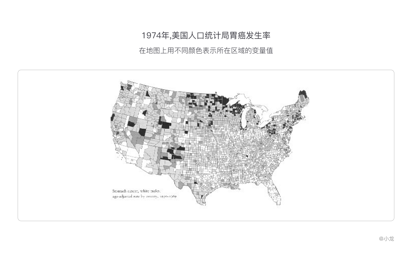 1974年,美國人口統計局胃癌發生率,在地圖上用不同顏色表示所在區域的變量值。
