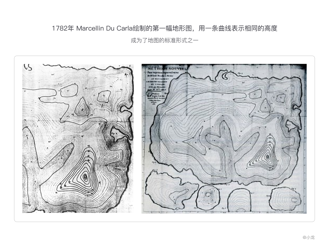 1782年Marcellin Du Carla繪製的第一幅地形圖,用一條曲線表示相同的高度,對於測繪,工程和軍事有著重大的意義,成為了地圖的標準形式之一。