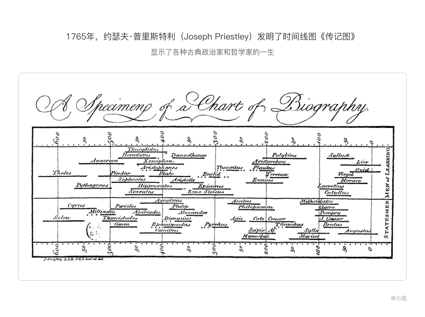 1765年,約瑟夫·普里斯特利(Joseph Priestley)發明了時間線圖《傳記圖》,顯示了各種古典政治家和哲學家的一生。 Priestley不僅在時間軸上列出了姓名,出生年和死亡年,而且還列出了出生年和死亡年,從而可以看出歷史人物所處時代。時間表證明是成功的,並直接啟發了Playfair發明條形圖,該條形圖首次出現在他的“商業和政治地圖集”中。