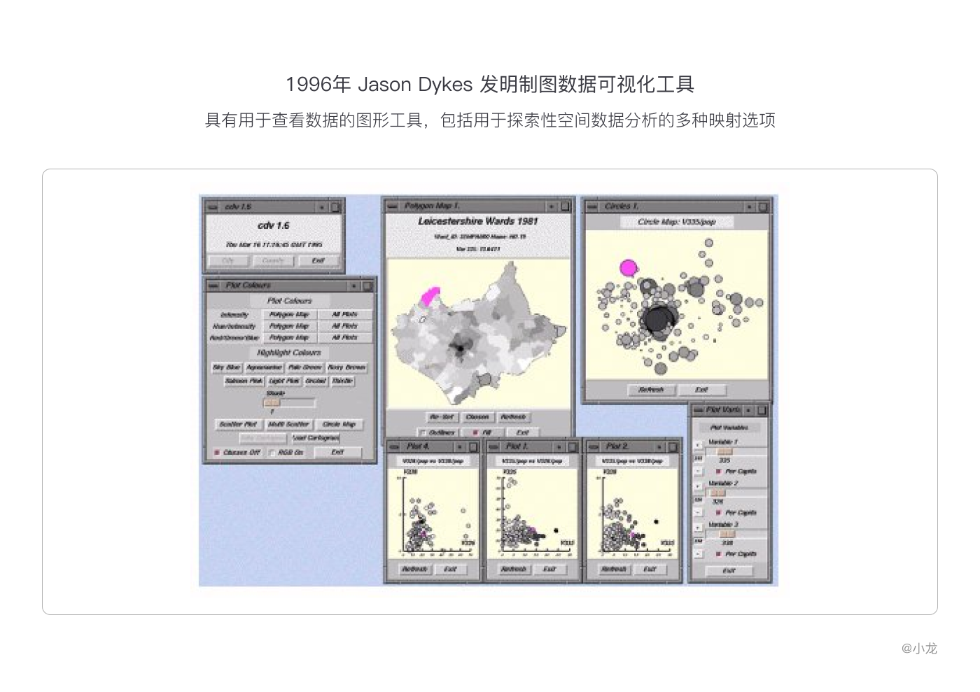 1996年Jason Dykes 發明製圖數據可視化工具:一種地圖可視化工具包,具有用於查看數據的圖形工具,包括用於探索性空間數據分析的多種映射選項。