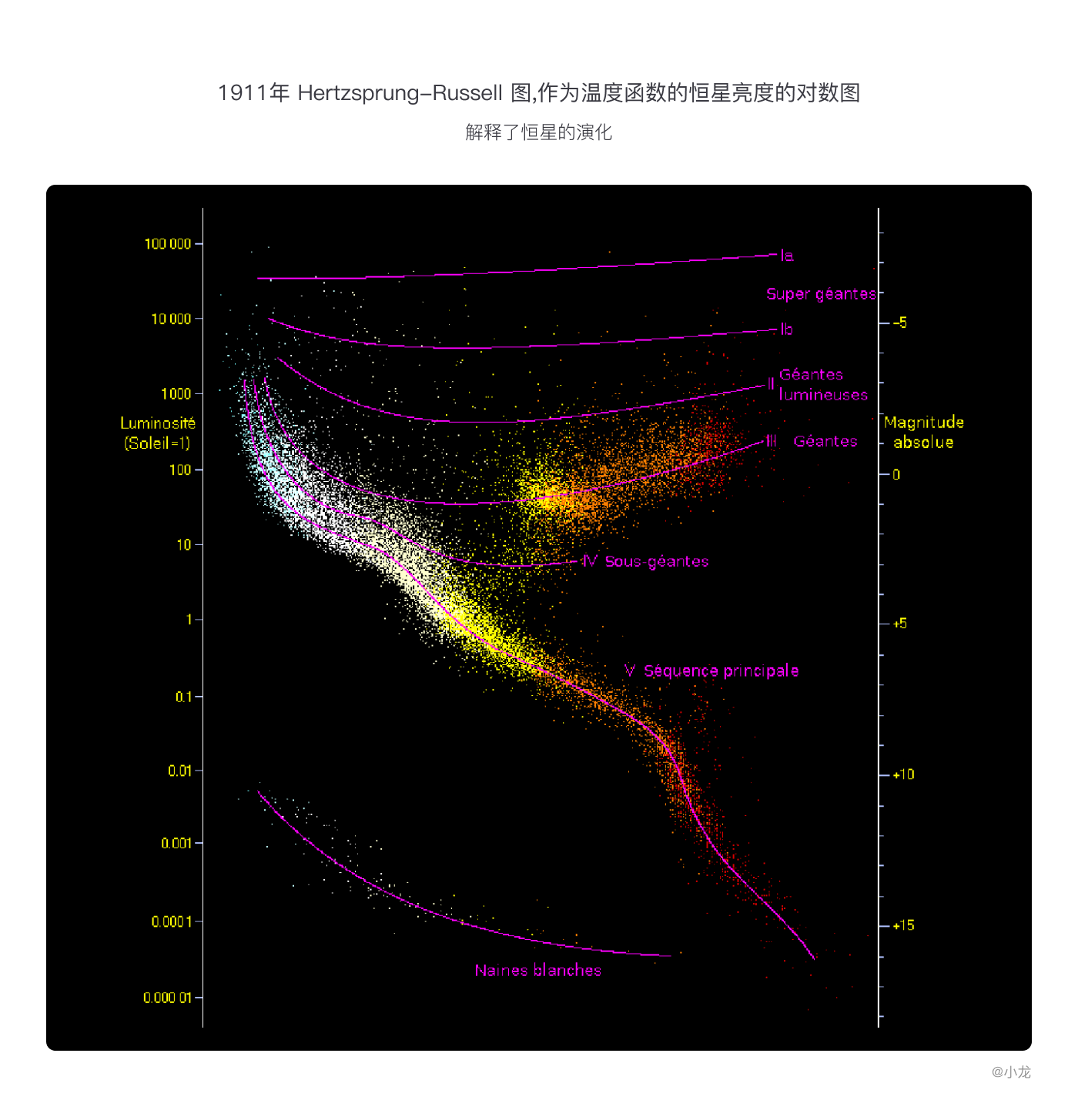 1911年Hertzsprung-Russell 圖,作為溫度函數的恆星亮度的對數圖,解釋了恆星的演化,成為現代天體物理的奠基之一。