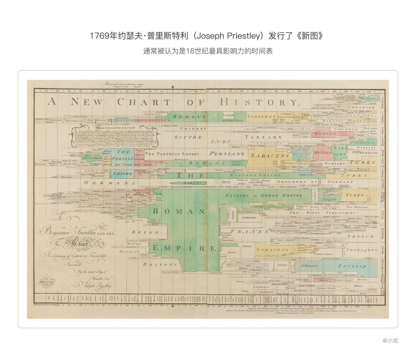 1769年約瑟夫·普里斯特利(Joseph Priestley)發行了通常被認為是18世紀最具影響力的時間表《新圖》,顯示帝國的興衰。水平線傳達了成名,影響力,權力和統治力的持續時間的概念。垂直閱讀傳達了思想,事件和人的同時性印象,空隙表示例如知識分子的黑暗時代。這一幅作品直接激發了柱狀圖的誕生。