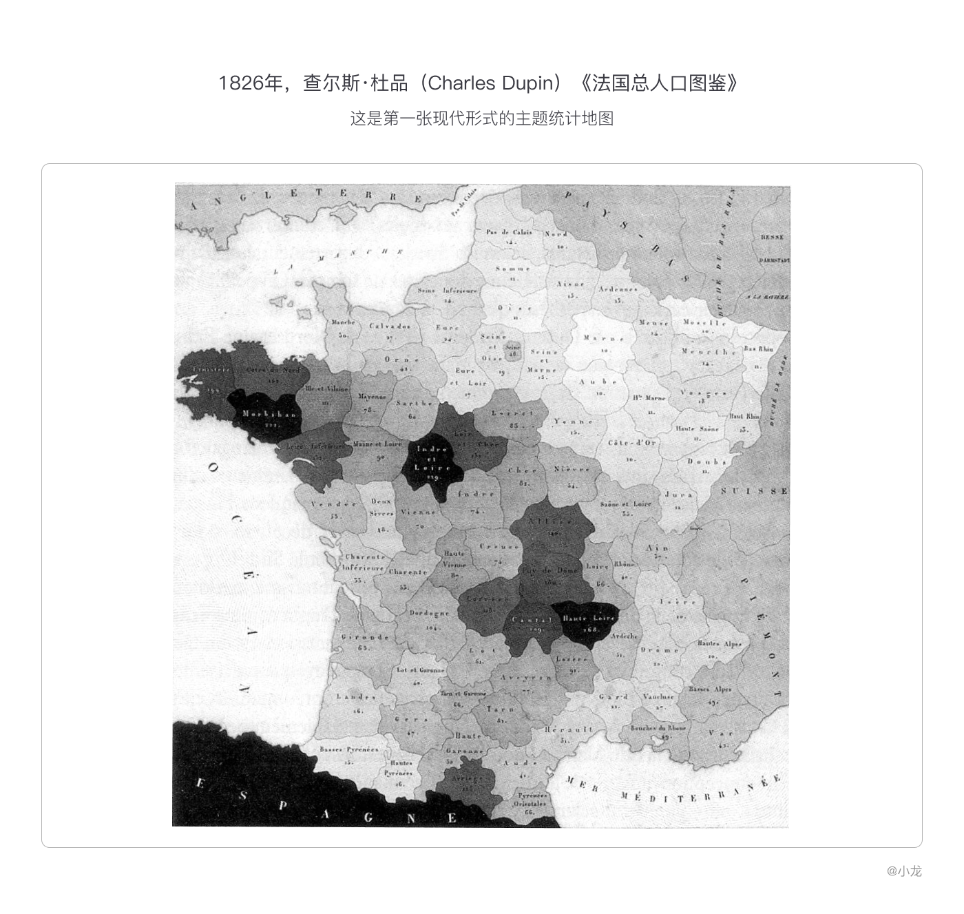 1826年,查爾斯·杜品(Charles Dupin)《法國總人口圖鑑》 :發明了連續使用黑白底紋(黑白程度)來顯示法國識字分佈情況的方法,這是第一張現代形式的主題統計地圖。