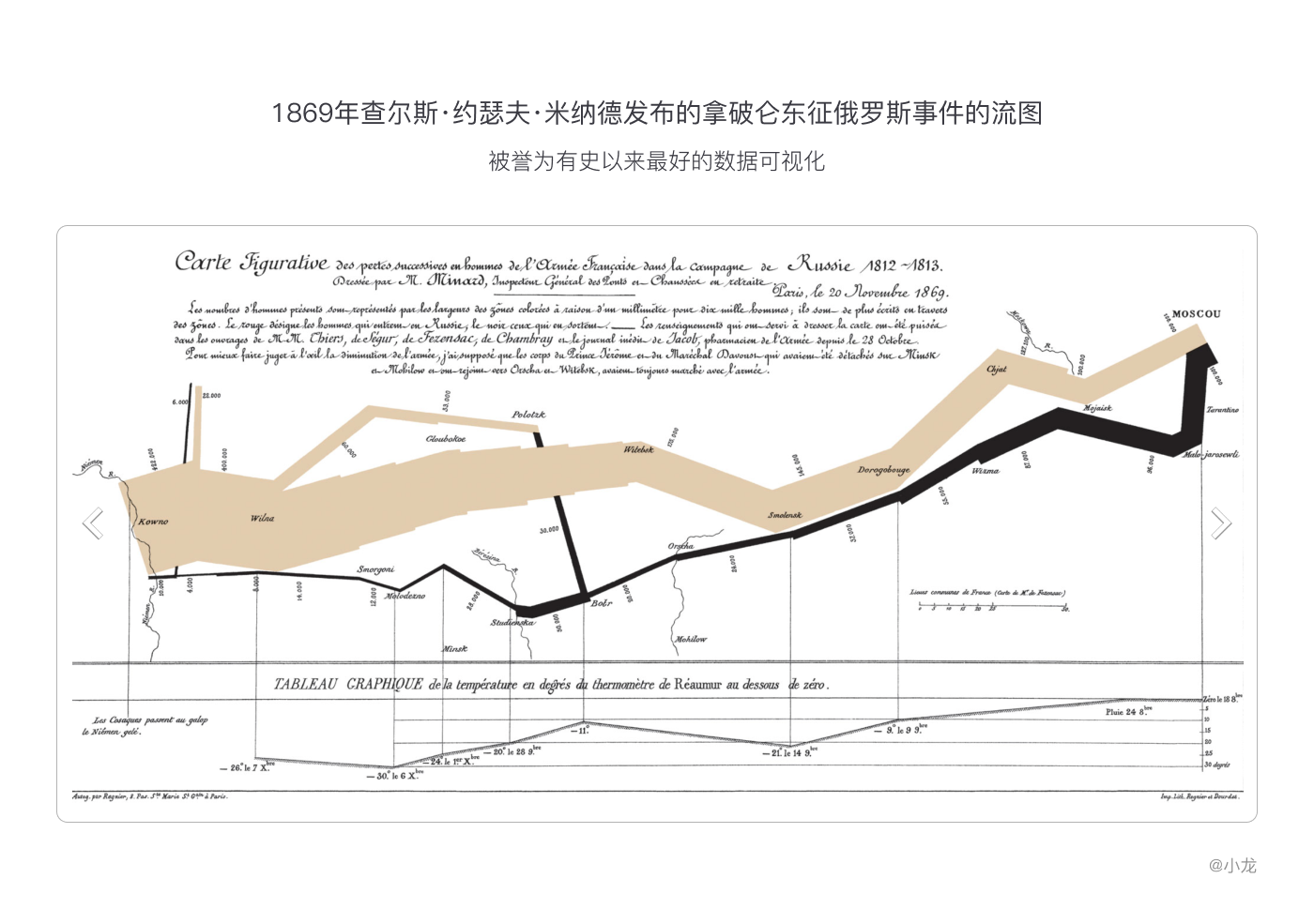 1869年查爾斯·約瑟夫·米納德發布的1812年拿破崙東征俄羅斯事件的流圖,被譽為有史以來最好的數據可視化。他的流圖呈現了拿破崙軍隊的位置和行軍方向、軍隊匯集、分散和重聚的時間地點、減員等信息。