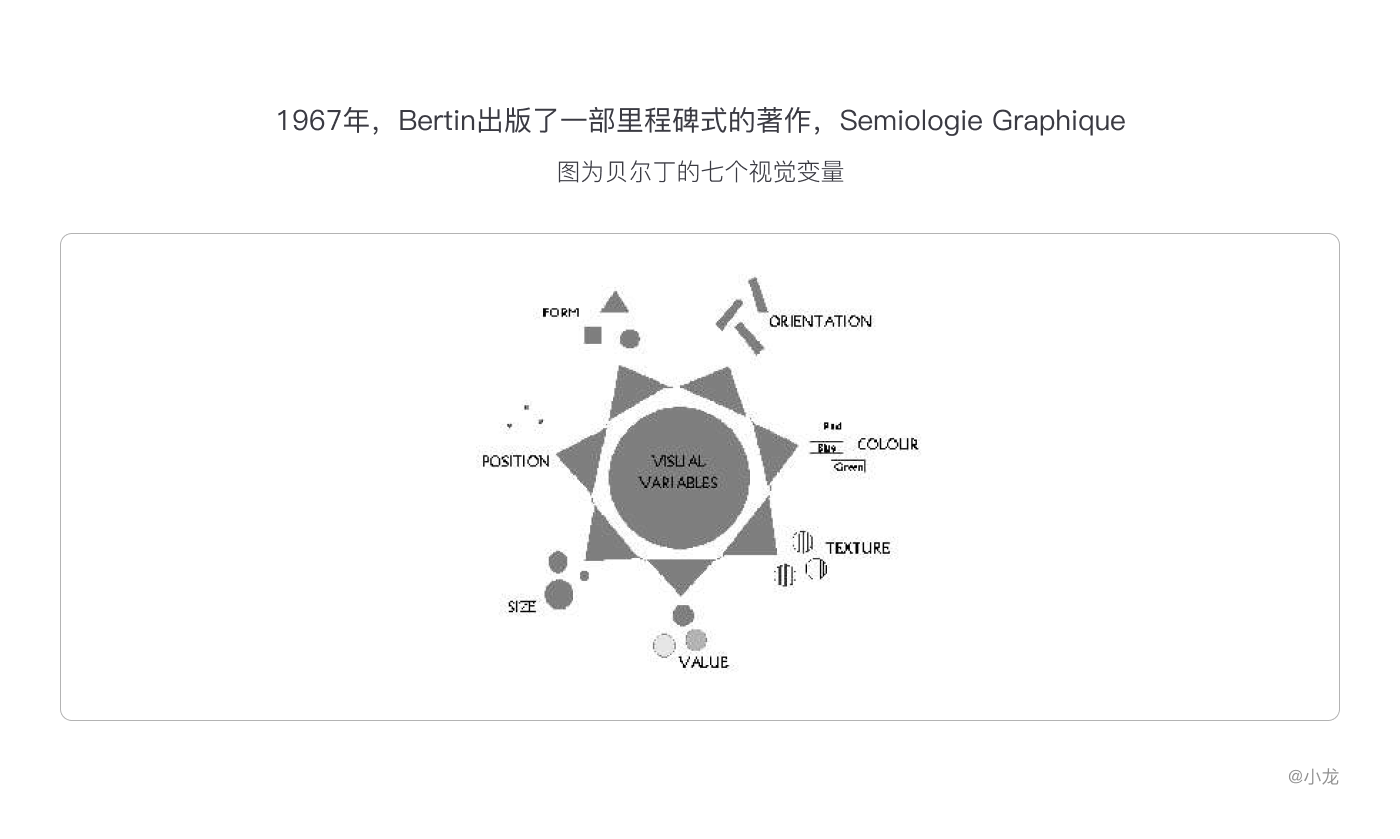 1967年,Jacques Bertin 出版了一部里程碑式的著作,Semiologie Graphique。這部書根據數據的聯繫和特徵,來組織圖形的視覺元素,為信息的可視化提供了一個堅實的理論基礎。圖為貝爾丁的七個視覺變量。