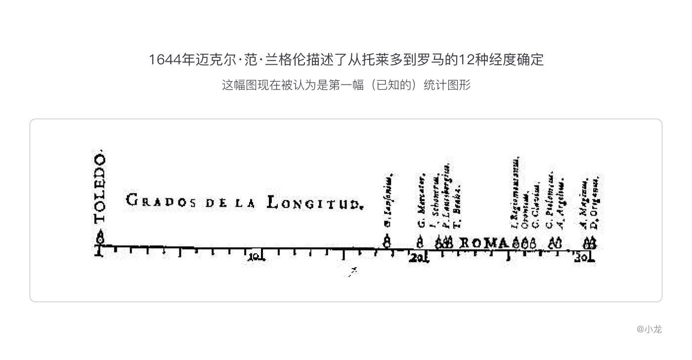 1644年邁克爾·範·蘭格倫(Michael van Langren)描述了從托萊多到羅馬的12種經度確定:很可能是統計數據的第一個視覺表示。這幅圖現在被認為是第一幅(已知的)統計圖形。這幅圖以一維線圖的形式繪製了在托萊多到羅馬之間12個當時已知的經度差異。在經度上標註了觀測的天文學家的名字,有效的安排了數據的表達方式,堪稱里程碑之作。