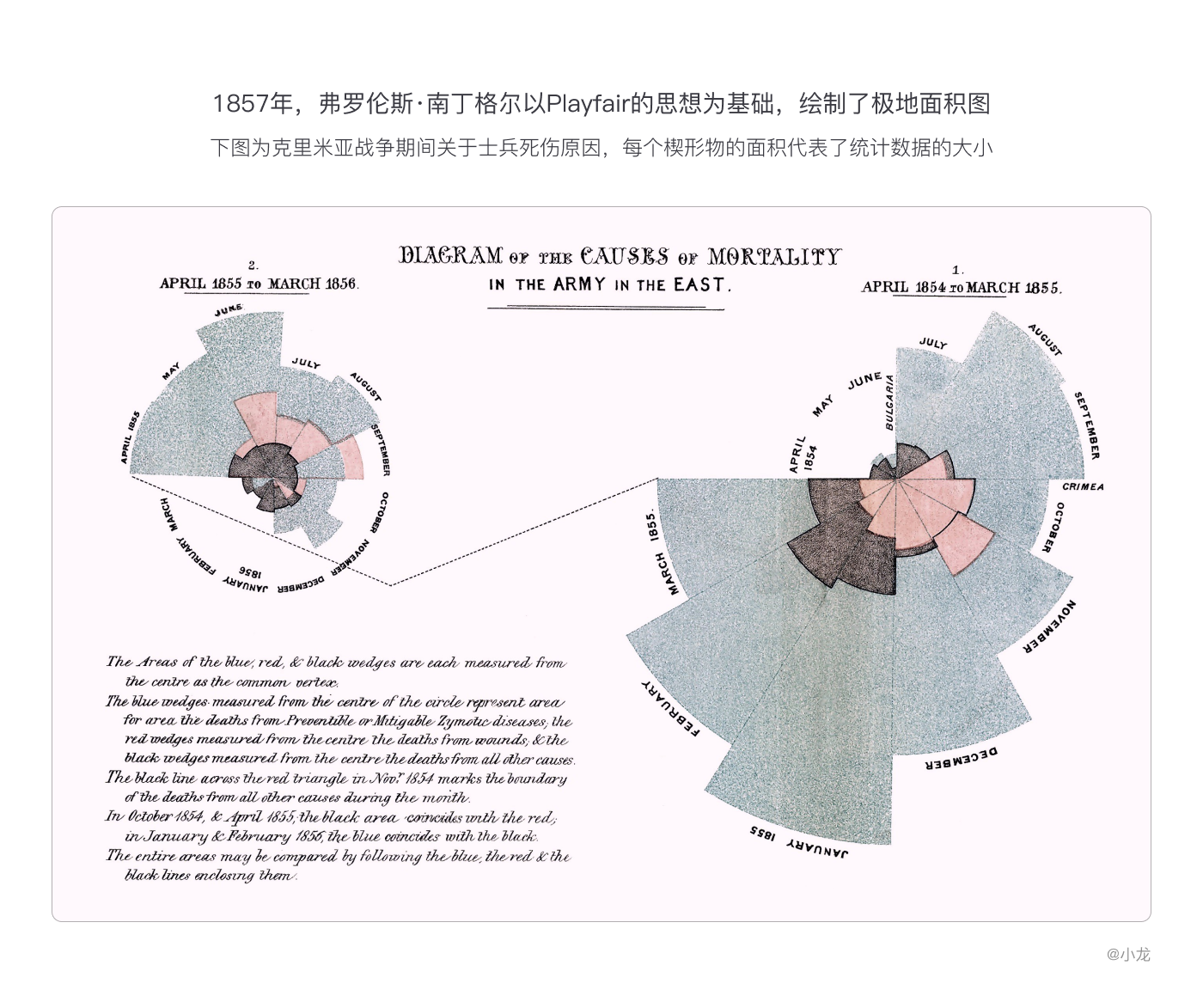 1857年,她以Playfair的思想為基礎,將圖表併入她的許多出版物中,繪製了極地面積圖Coxcomb。下圖為東方軍隊中死亡原因圖,該圖表按月描繪了克里米亞戰爭期間關於士兵死傷原因,每個楔形物的面積代表了統計數據的大小。