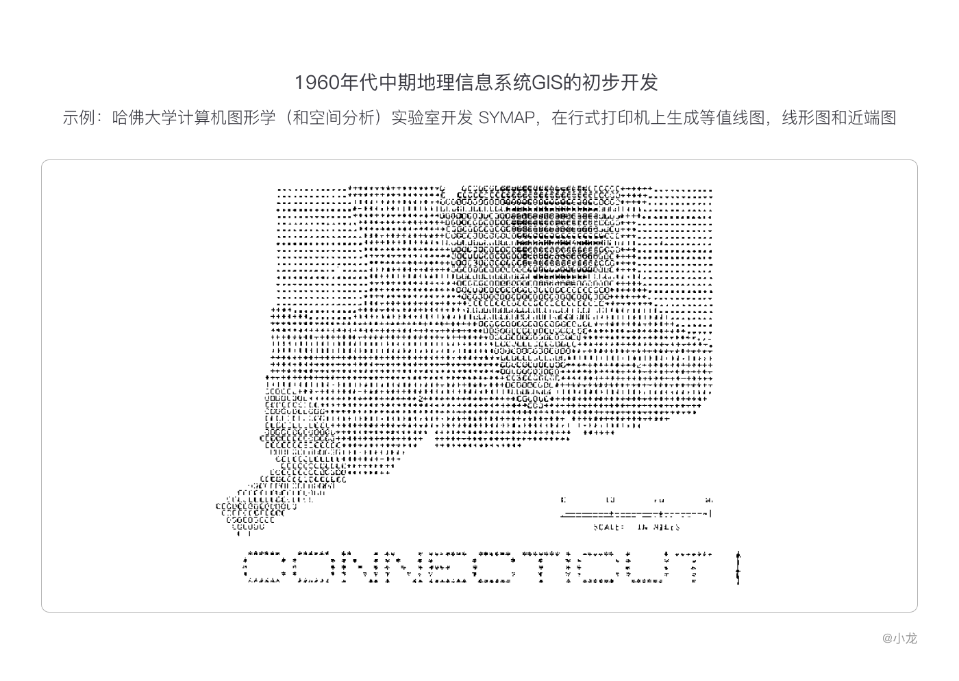 1960年代中期地理信息系統GIS的初步開發,結合了空間參考數據,空間模型和基於地圖的可視化。示例:哈佛大學計算機圖形學(和空間分析)實驗室開發SYMAP,在行式打印機上生成等值線圖,線形圖和近端圖。