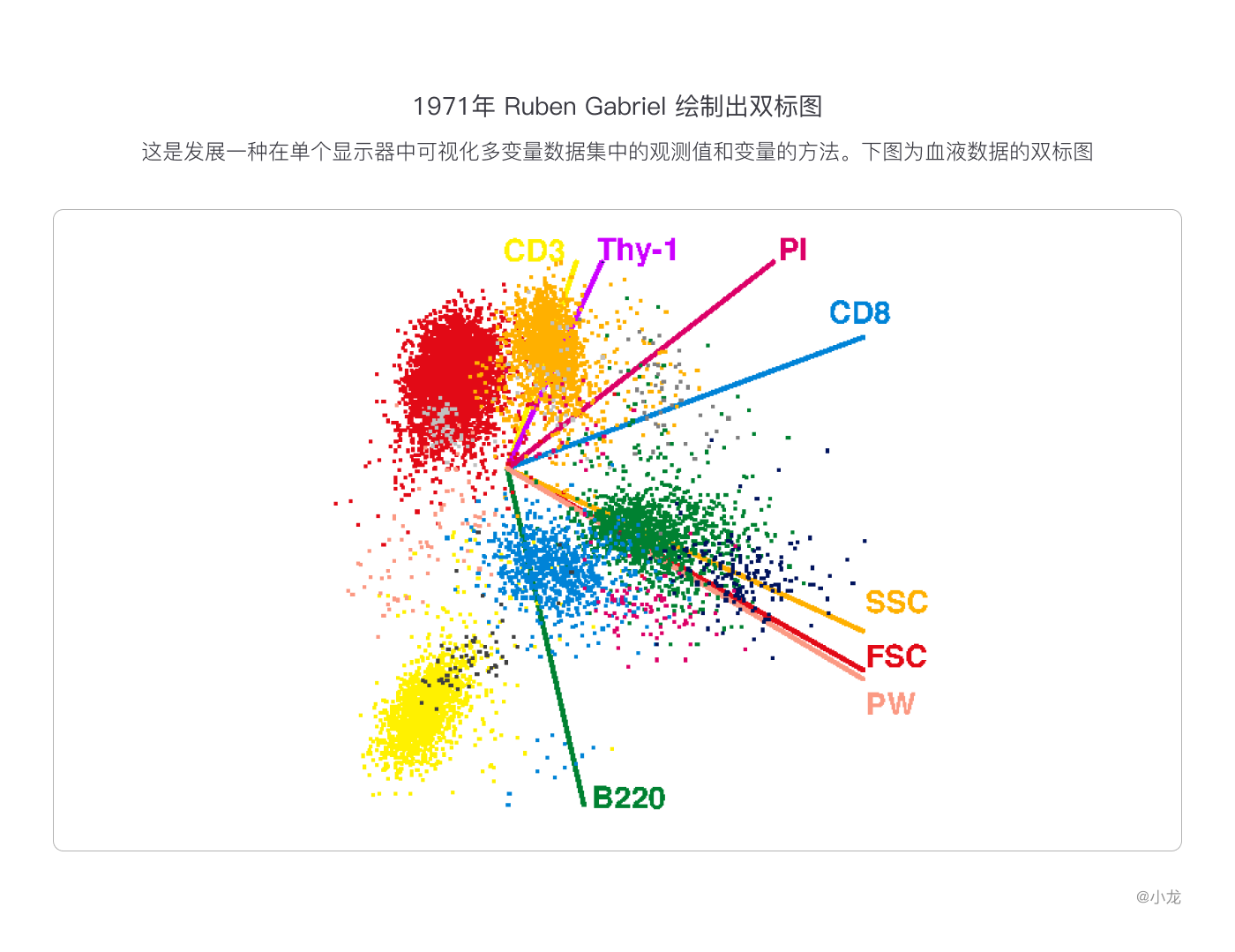 1971年Ruben Gabriel 繪製出雙標圖,這是發展一種在單個顯示器中可視化多變量數據集中的觀測值和變量的方法。觀測值通常由點表示,變量由向量表示,使得點沿向量的位置代表數據值。下圖為血液數據的雙標圖。