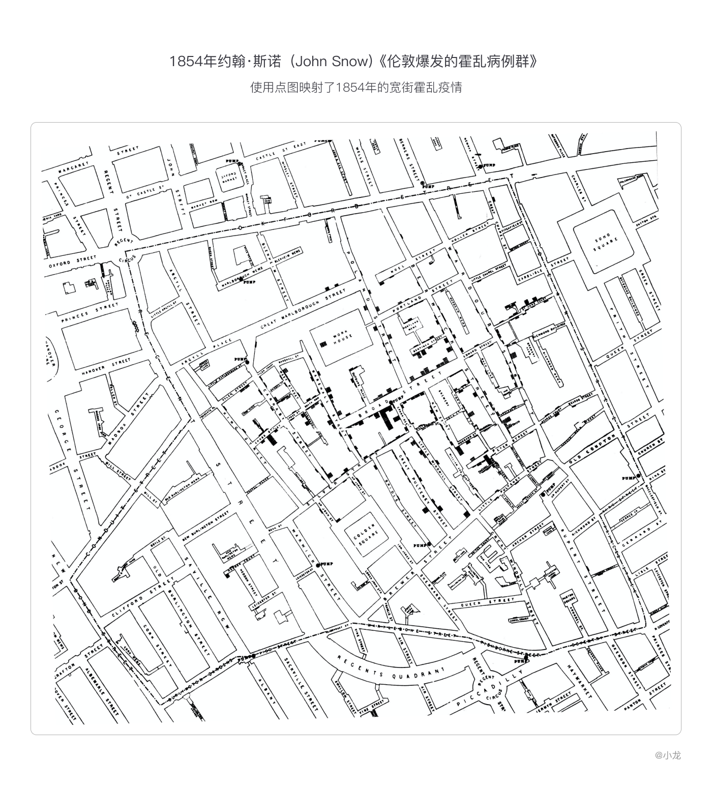 1854年約翰·斯諾(John Snow) 《倫敦爆發的霍亂病例群》 :使用點圖映射了1854年的寬街霍亂疫情,他還使用統計數據來說明水源質量與霍亂病例之間的聯繫,這表明該疾病是通過受污染的水傳播的,而不是以前認為的空氣傳播的斯諾的研究是公共衛生和地理歷史上的重大事件。它被認為是流行病學的創始事件。
