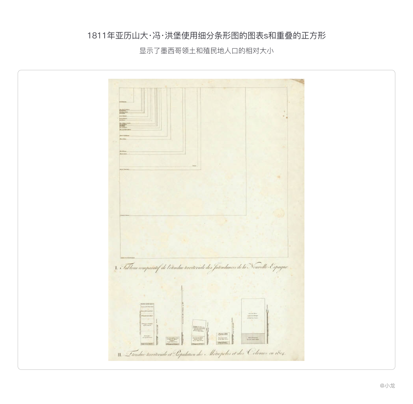 1811年亞歷山大·馮·洪堡使用細分條形圖的圖表s和重疊的正方形,顯示了墨西哥領土和殖民地人口的相對大小。