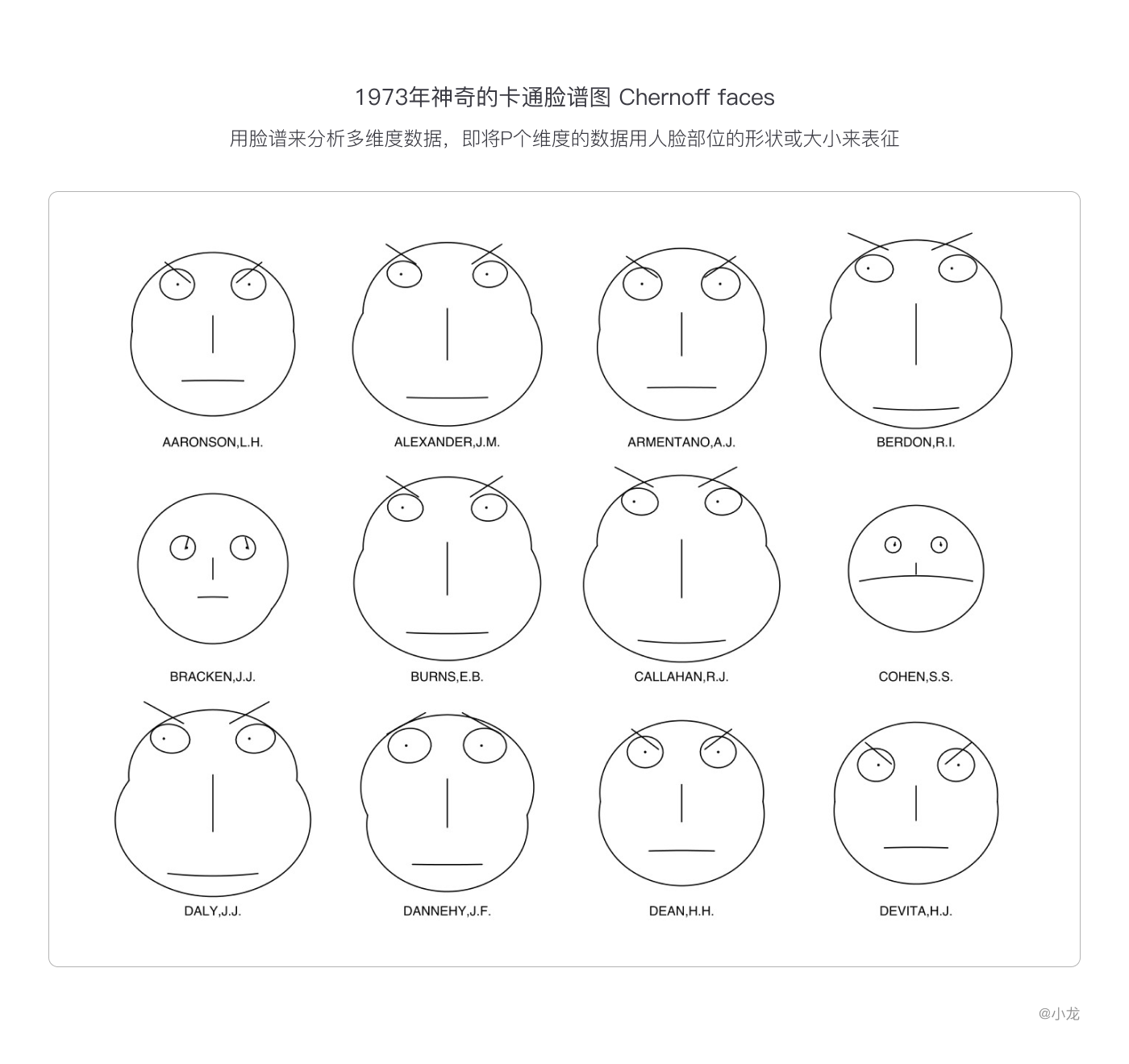 1973年神奇的卡通臉譜圖Chernoff faces。用臉譜來分析多維度數據,即將P個維度的數據用人臉部位的形狀或大小來表徵。