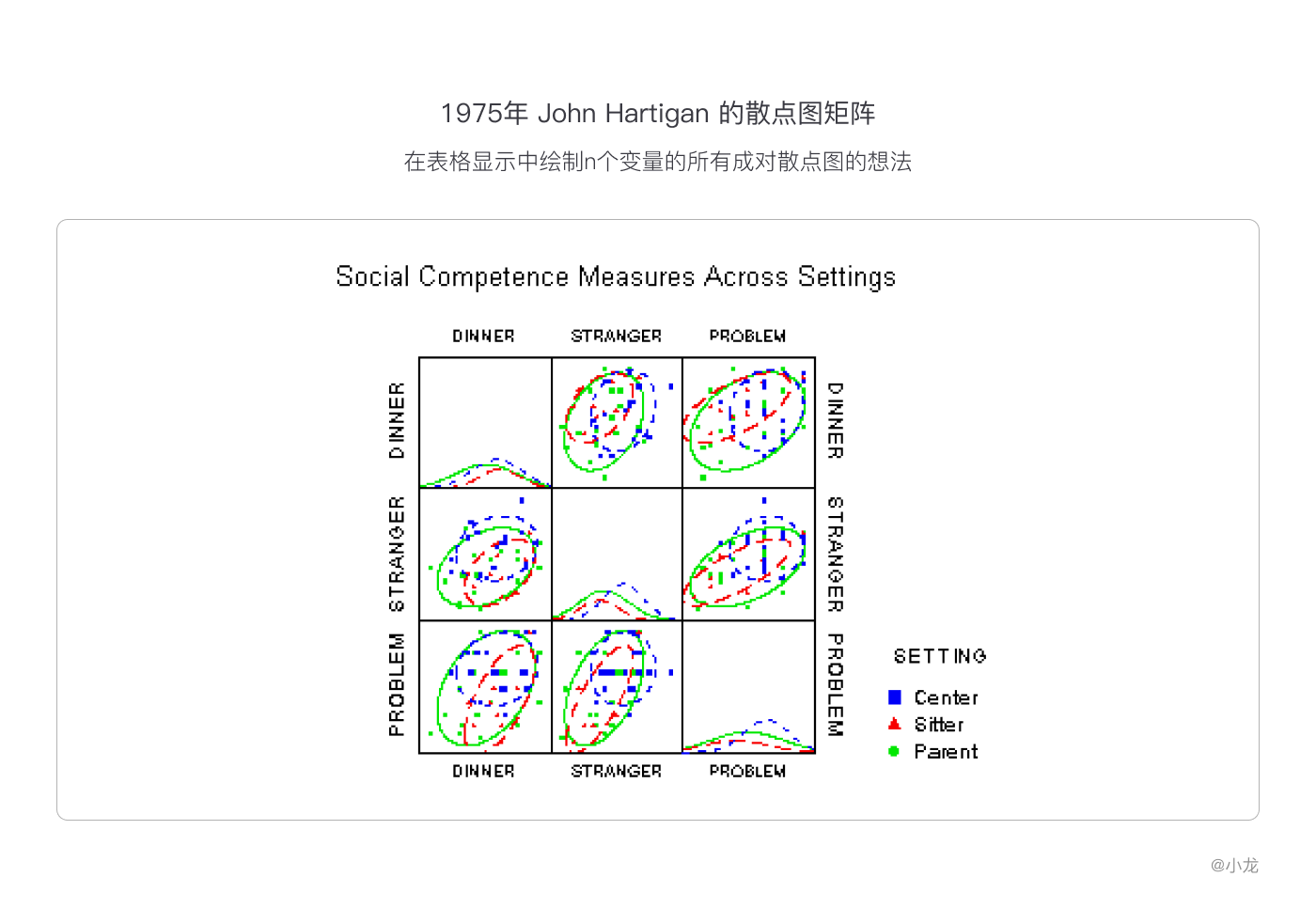 1975年John Hartigan 的散點圖矩陣,在表格顯示中繪製n個變量的所有成對散點圖的想法。