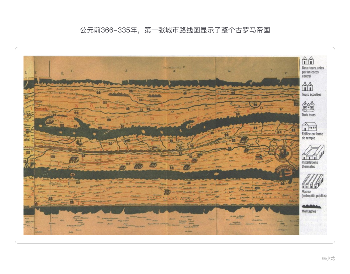 公元前366-335年,第一張城市路線圖顯示了整個羅馬世界,這是從維也納到意大利,再到迦太基的地圖信息,被塗在羊皮紙上。 (以16世紀德國收藏家的名字命名為Peutinger)