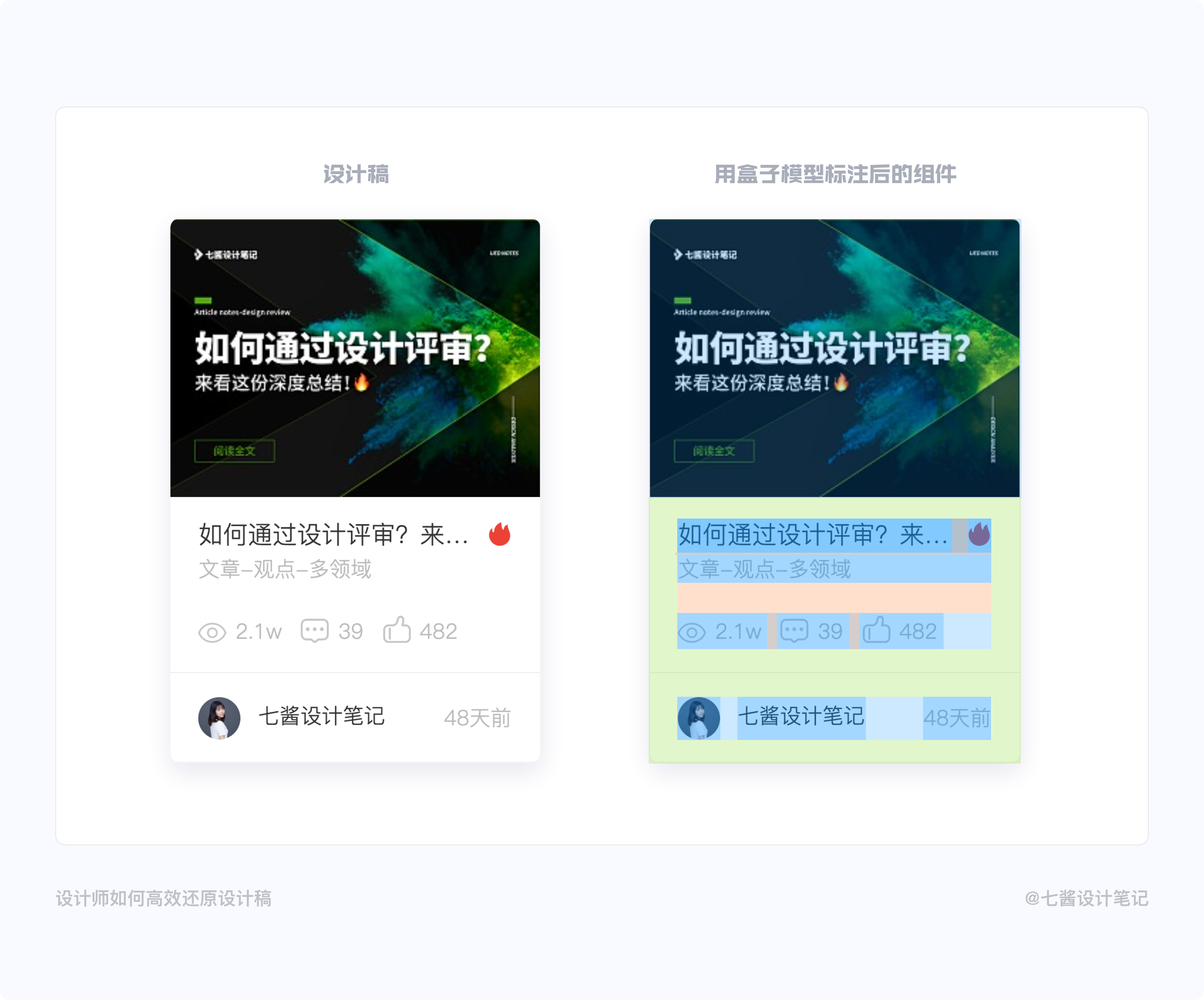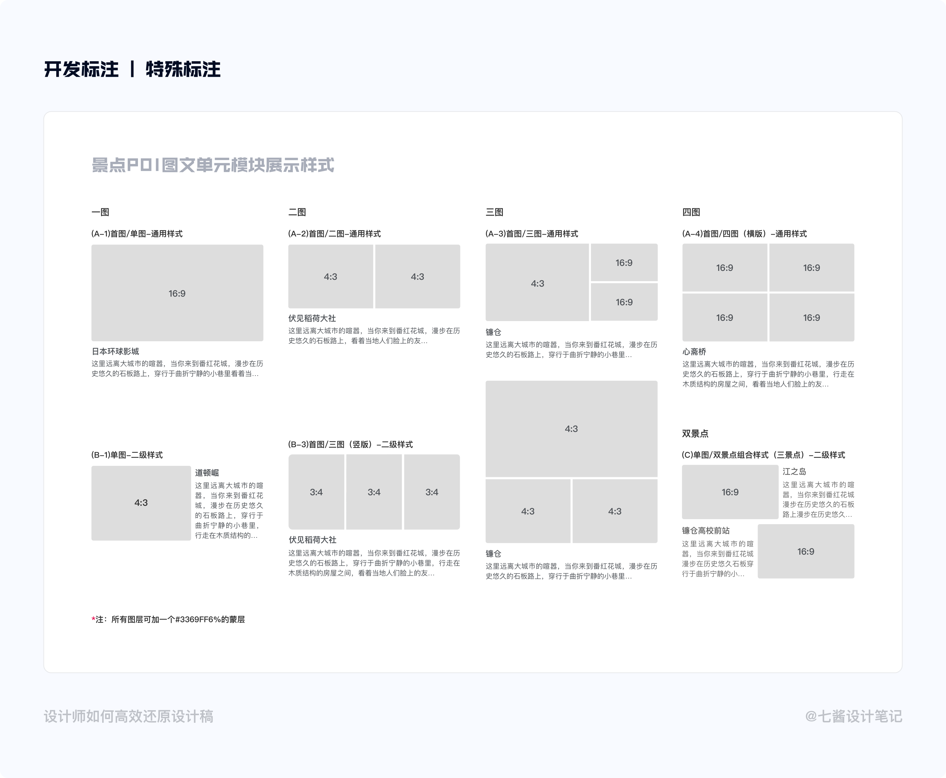 開發標註是從設計稿落地成代碼的主要參考,除了藍湖提供的標註,我們還需要寫一些重要部分設計說明,例如:模塊區分、局部特殊設計(該內容根據自身產品而確定)。