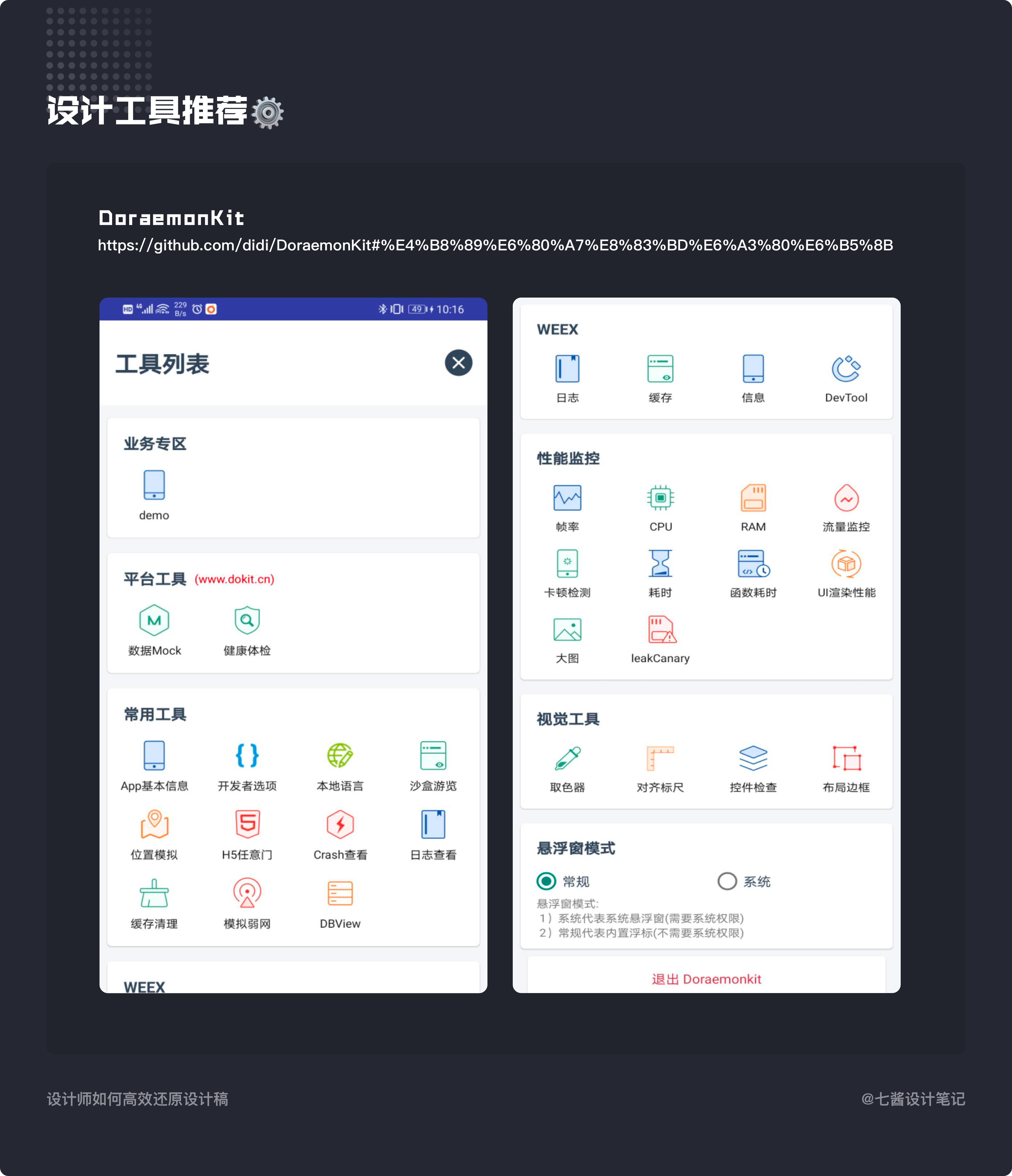 推薦DoraemonKit 是一個功能平台,能夠讓每一個App 快速接入一些常用的或者你沒有實現的一些輔助開發工具、測試效率工具、視覺輔助工具,而且能夠完美在Doraemon 面板中接入你已經實現的與業務緊密耦合的一些非通有的輔助工具,並搭配滴滴的dokit平台,讓功能得到延伸,接入方便,便於擴展。