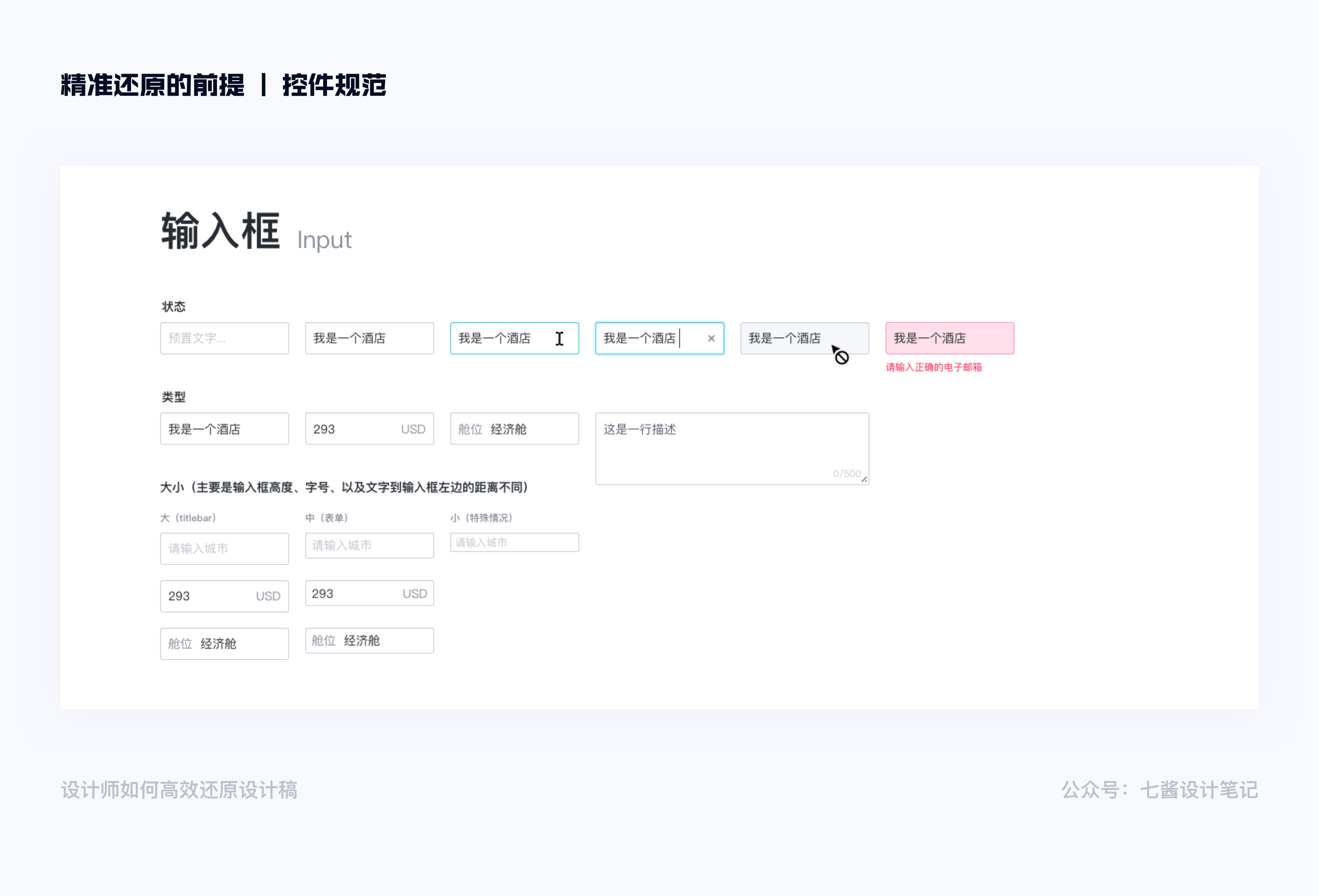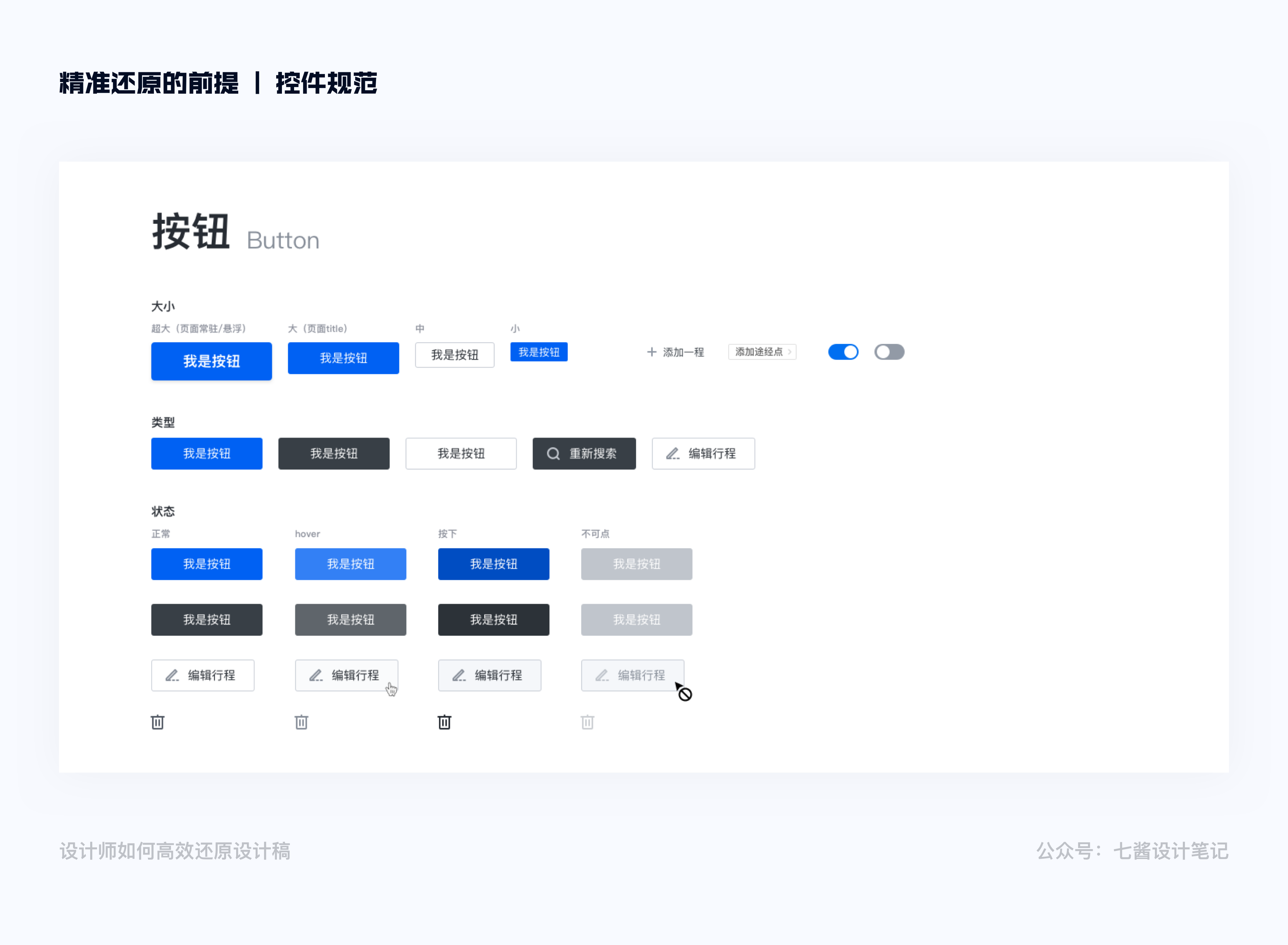 按鈕有5 個狀態:正常、點擊、懸停、加載、禁用。需要在規範中分別羅列出這五個狀態,標註上對應的按鈕填充色、邊框色、圓角值、按鈕寬度和高度,按鈕文本大小、顏色值。如果是圖標按鈕的話,除了上述參數值以外,還需要標註icon 和按鈕文本之間的間距,icon 圖標的大小。