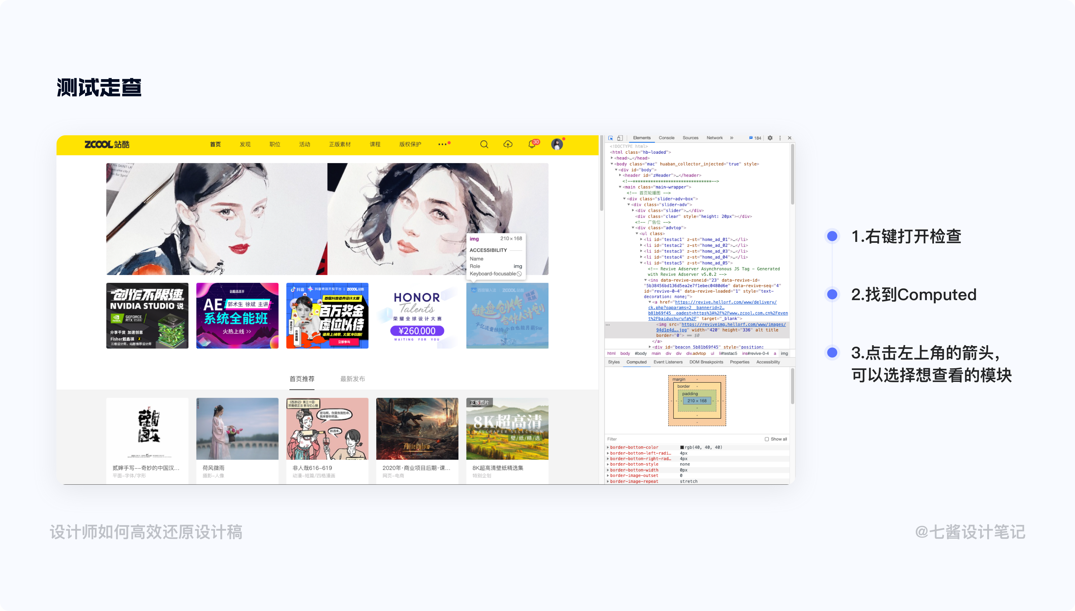 走查還原的時候,在Chrome瀏覽器的空白處右鍵點擊檢查,找到裡面的Computed窗口,我們可以找到具體的文字、間距、投影等屬性。有時候一些比較細微的調整,我們可以雙擊具體的數值進行調整,調整到自己滿意之後再給到具體的數值給開發,這樣就不用在我們搖擺不定的情況下,造成雙方的困擾。
