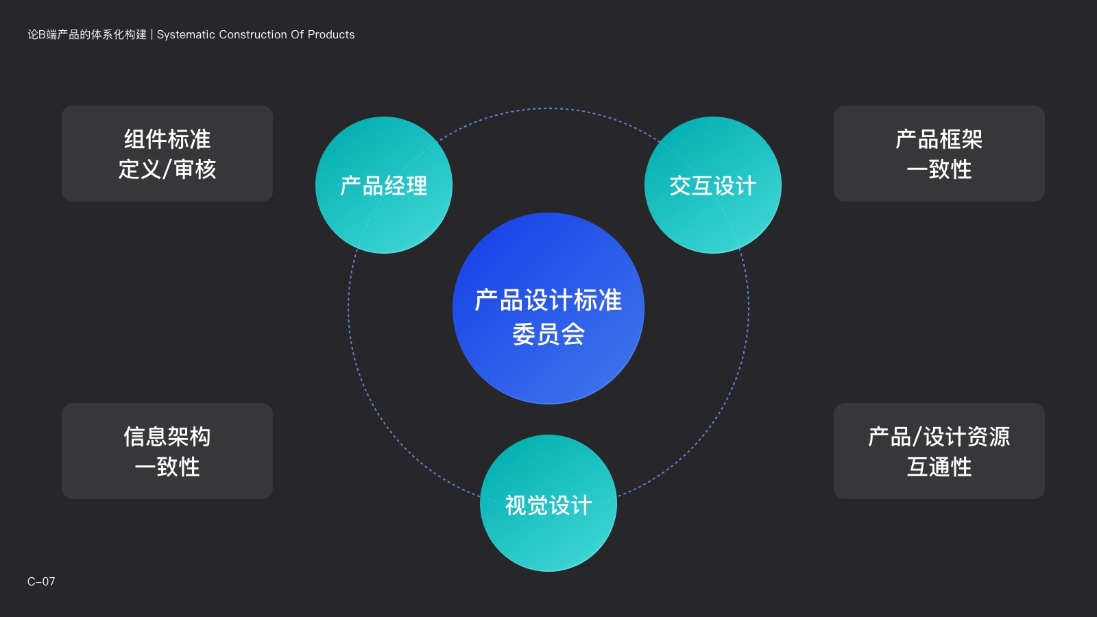 委員會可以是虛擬的項目組,也可以是一個群,在有需要的時候進行討論,並進行文檔的沉澱。當遇到有可能跨模塊的內容,或者能夠復用於其他模塊的通用方案時,都要通過委員會進行評審。同時,委員會可以定期對產品內容進行排查,查看在產品中是否含有可統一、可標準化的內容。